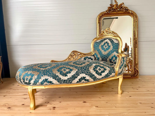 Chaise Longue Blue Velvet Damask French Antique Style in Gold Finish Retro Baroque Style Bench Green Velvet Damask for Home Decor