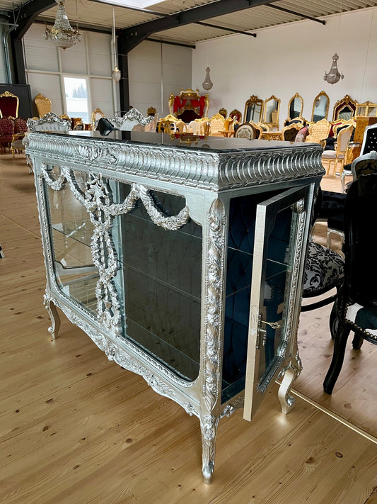 Display Cabinet Silver Black Color Baroque Antique Style Showcase Glass Door with Black Marble Top in Silver Finish for Home Decor