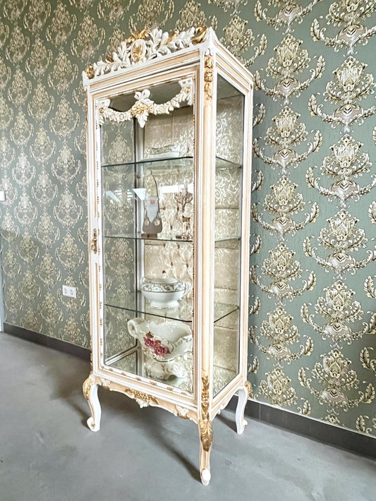 Display Cabinet Glass & Wood French Louis Style Showcase Antique Style Reproduction in Gold Finish Retro Baroque Style Display Cabinet