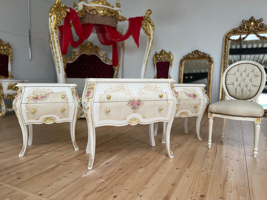French Baroque Style Painted Chest of Drawers: Floral Beige Dresser