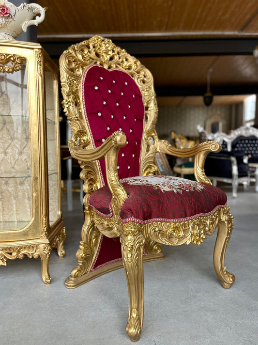 Gold French Baroque Throne Chair: Red Velvet, Hand-Carved Beech Wood