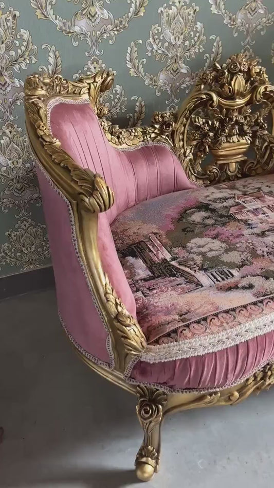 French Louis Style Chaise Lounge: Baroque Ottoman, Gold Finish