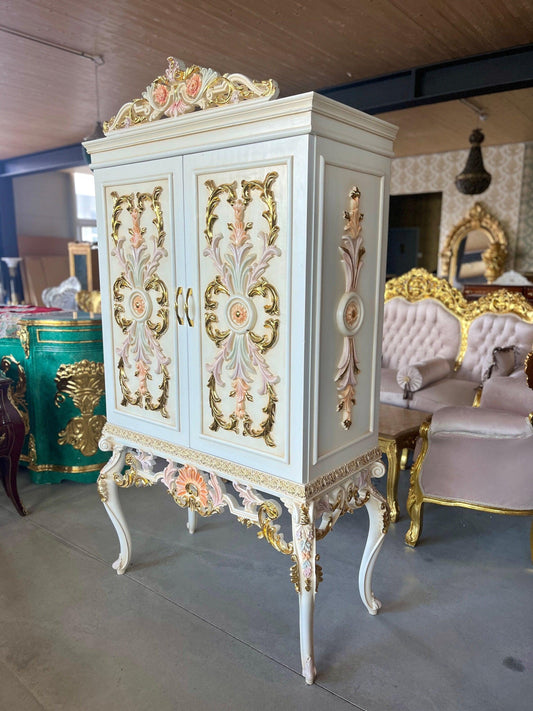 French Baroque Style Wooden Cabinet: Flower Carving, White Display Cabinet