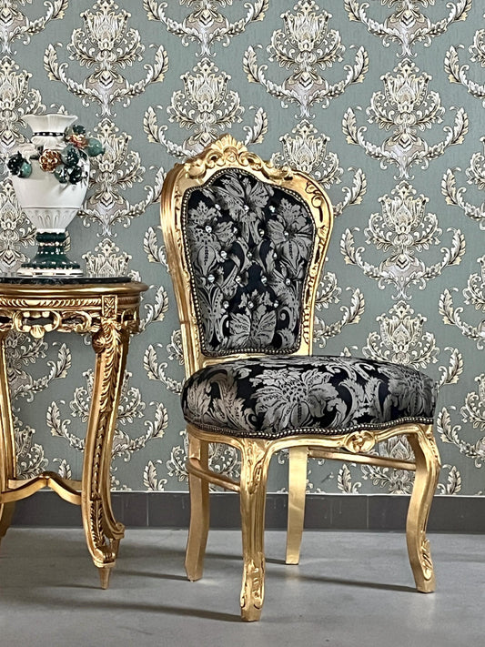 French Louis XV Baroque Dining Chair: Black Floral, Gold Leaf & Crystal