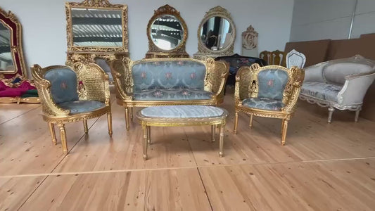 Royal Baroque Sofa Set: Blue Floral Damask, Gold Finish, Handcrafted