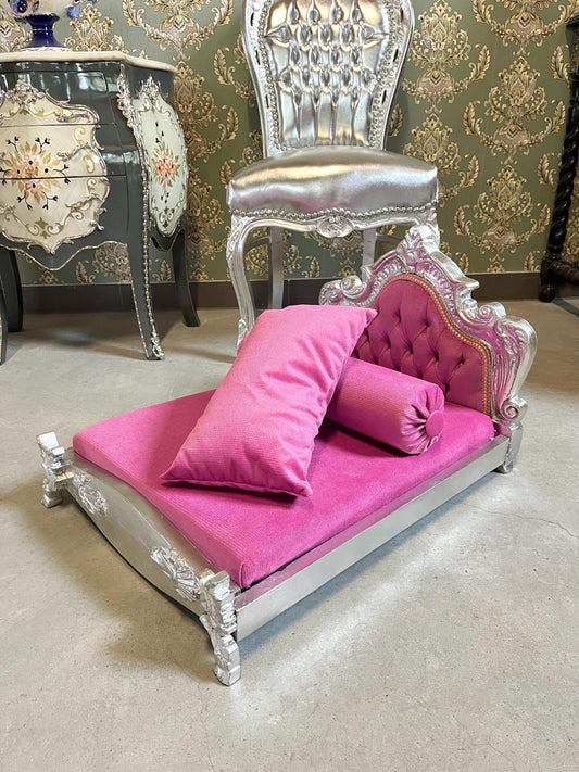 Haustierbett, französisches Hundebett im antiken Stil mit Gold-Finish, süßes Katzenbett im Barock-Rokoko-Stil aus pinkfarbenem und violettem Samt für ein glückliches Haustier