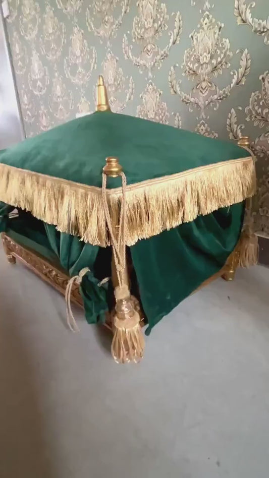 French Baroque Pet Bed: Emerald Velvet, Gold Finish, Detachable Roof
