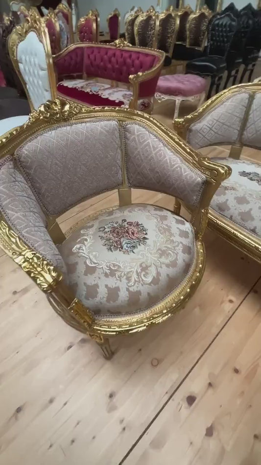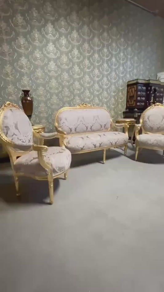 French Baroque Sofa Set: Beige Floral Embroidered Lounge, Gold Finish