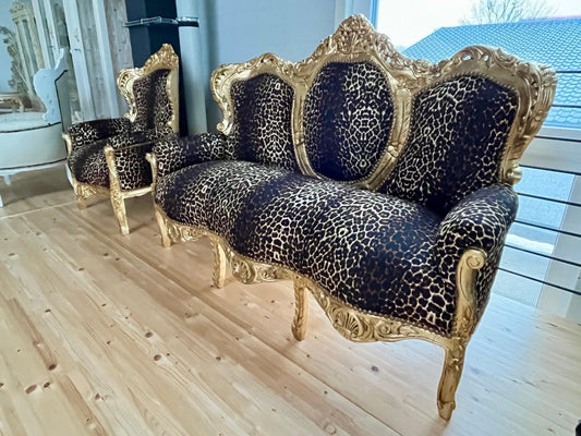 French Antique Style Couch: Royal Baroque Sofa, Leopard Print, Solid Red Color Velvet, Gold Finish