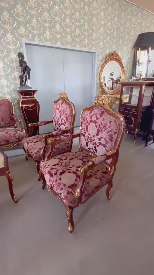 French Baroque Style Sofa Set: Bordeaux Floral Velvet, Gold Leaf Beechwood