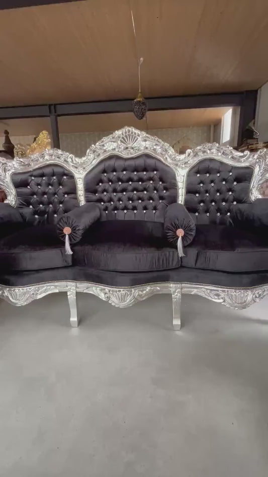 Baroque Sofa Set: French Louis Style, Silver & Black Velour