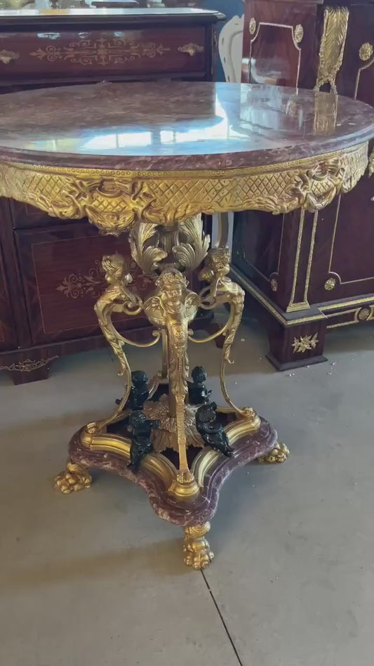 Royal Baroque Style Marble Top Table: French Antique Gold Accent