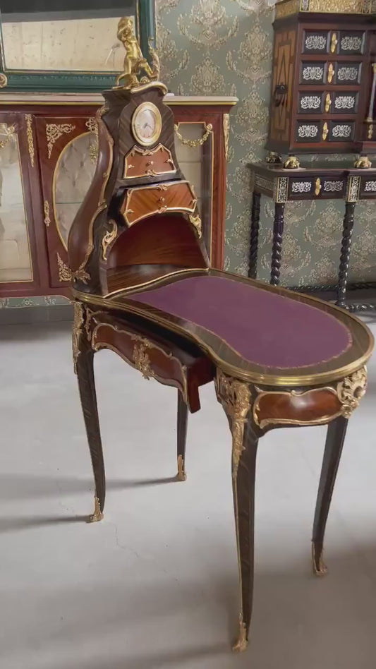 French Antique Style Writing Table with Clock & Bronze Angel Statue - Mahogany Wood