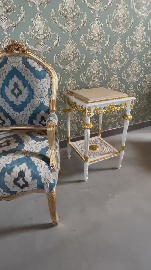 Baroque Style Marble Top Side Table: Gold Foil Accent, White Wood