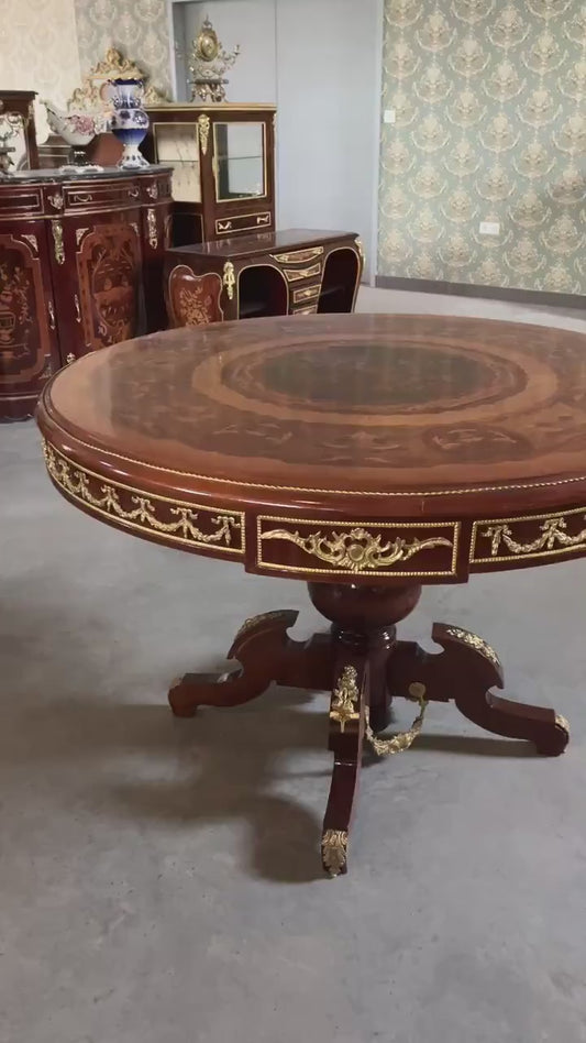 Antique Style Round Dining Table: Baroque Wood, Bronze Accents
