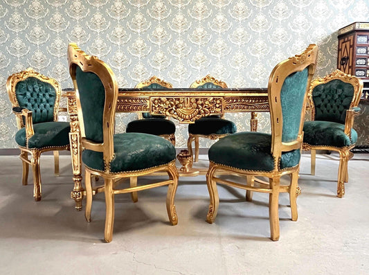 Baroque Rococo Dining Set: Gold Finish, Green Marble Table & 6 Chairs