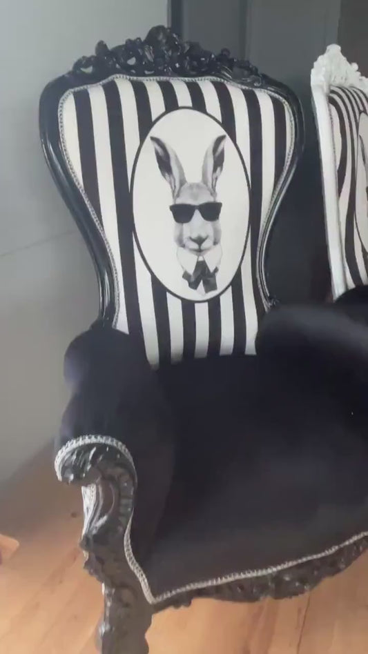 Rabbit Print Throne Armchair: Black & White Velvet, French Baroque Style