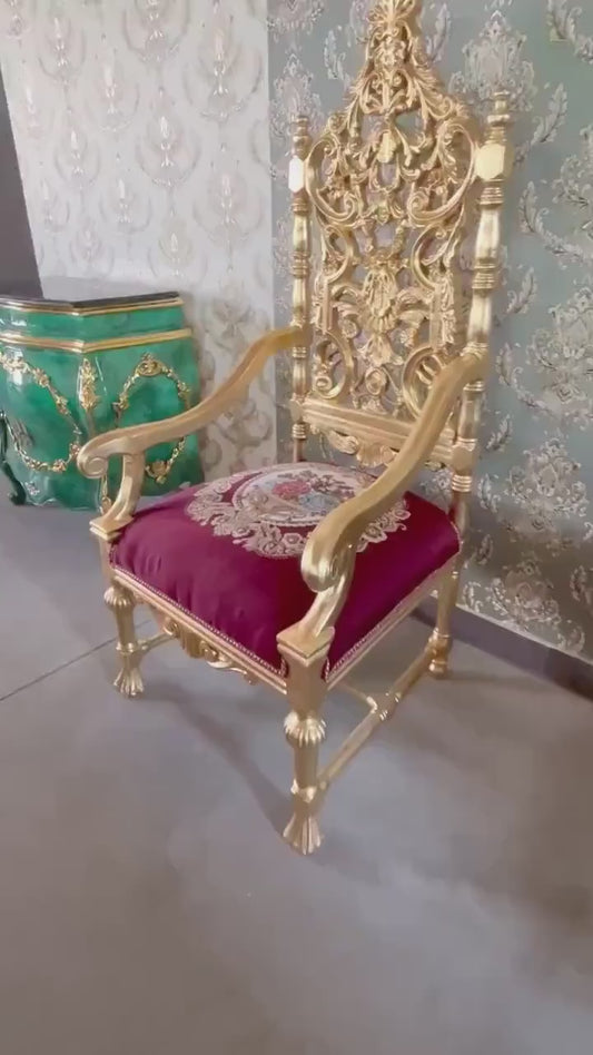 Gold French Baroque Throne Chair: Red Velvet, Hand-Carved Beech Wood