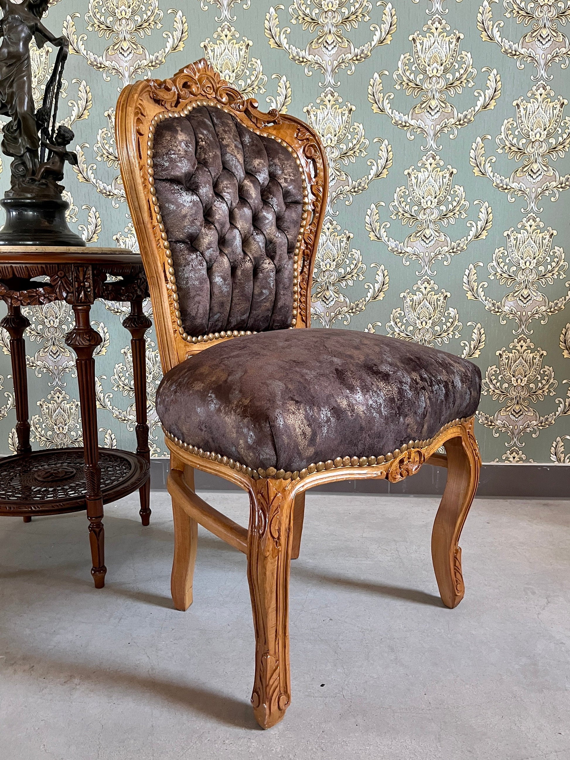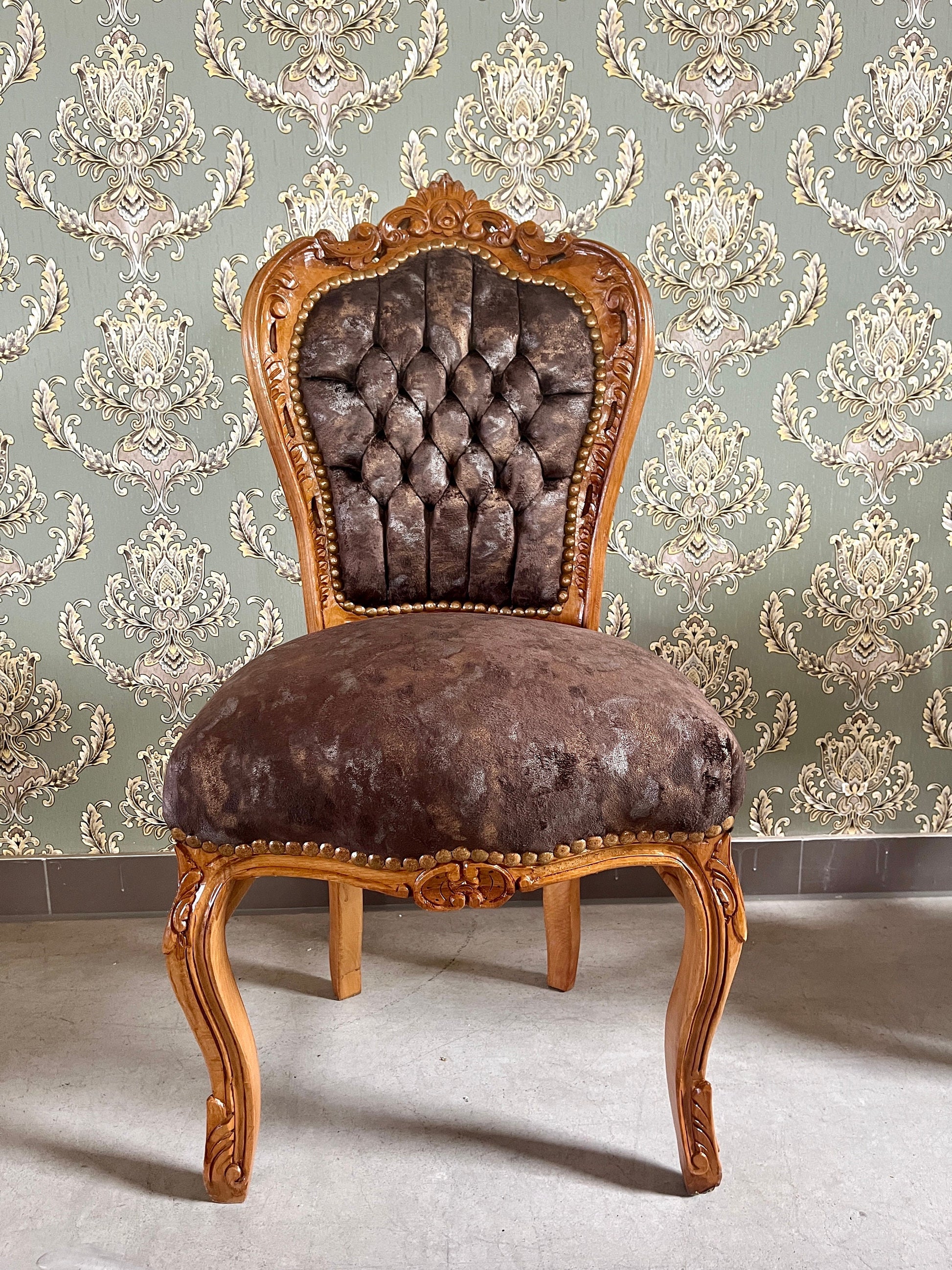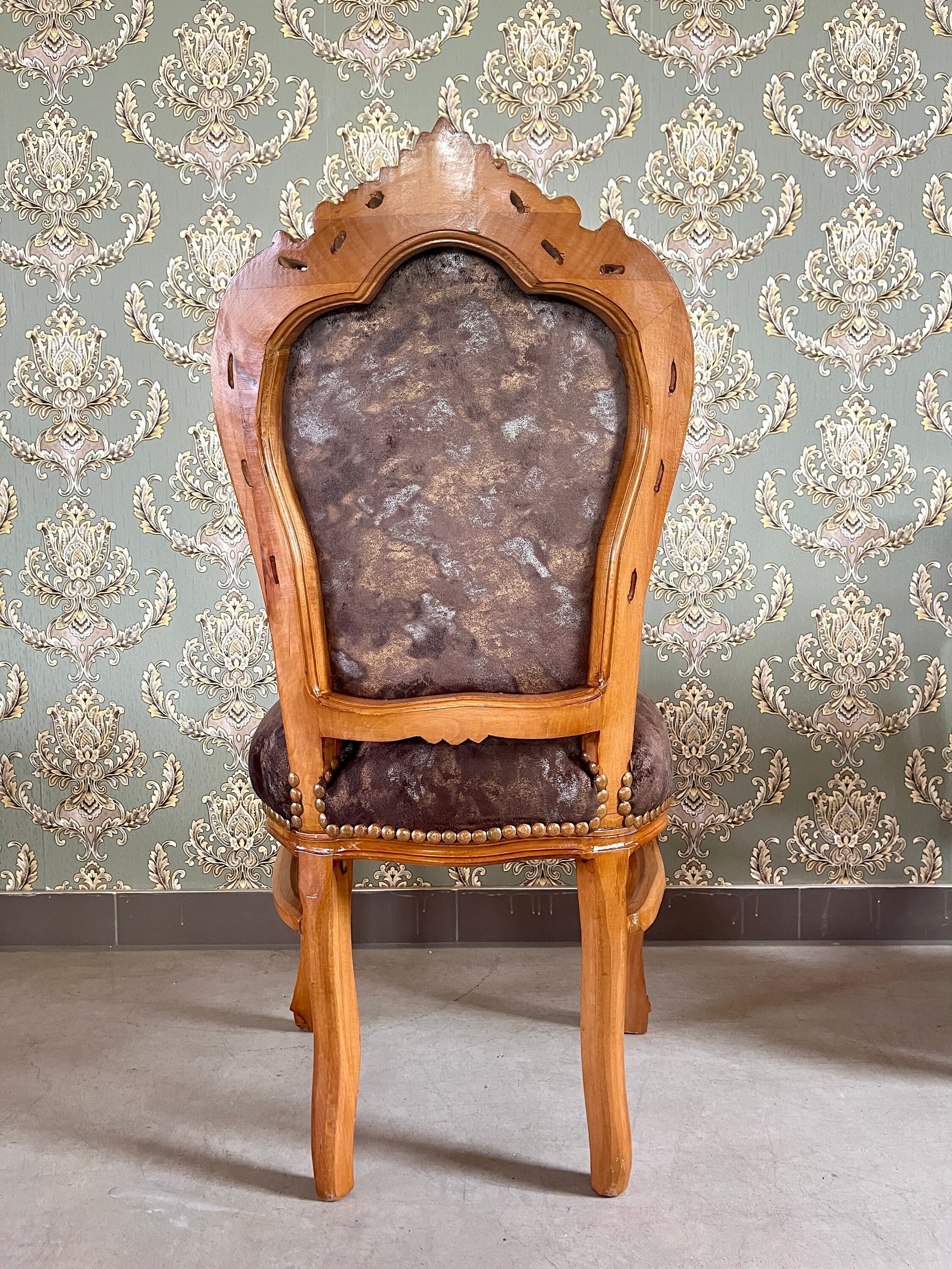 The chair is made of solid beech wood and upholstered with velvet in beautiful patterns and nails firmed to have a retro look.