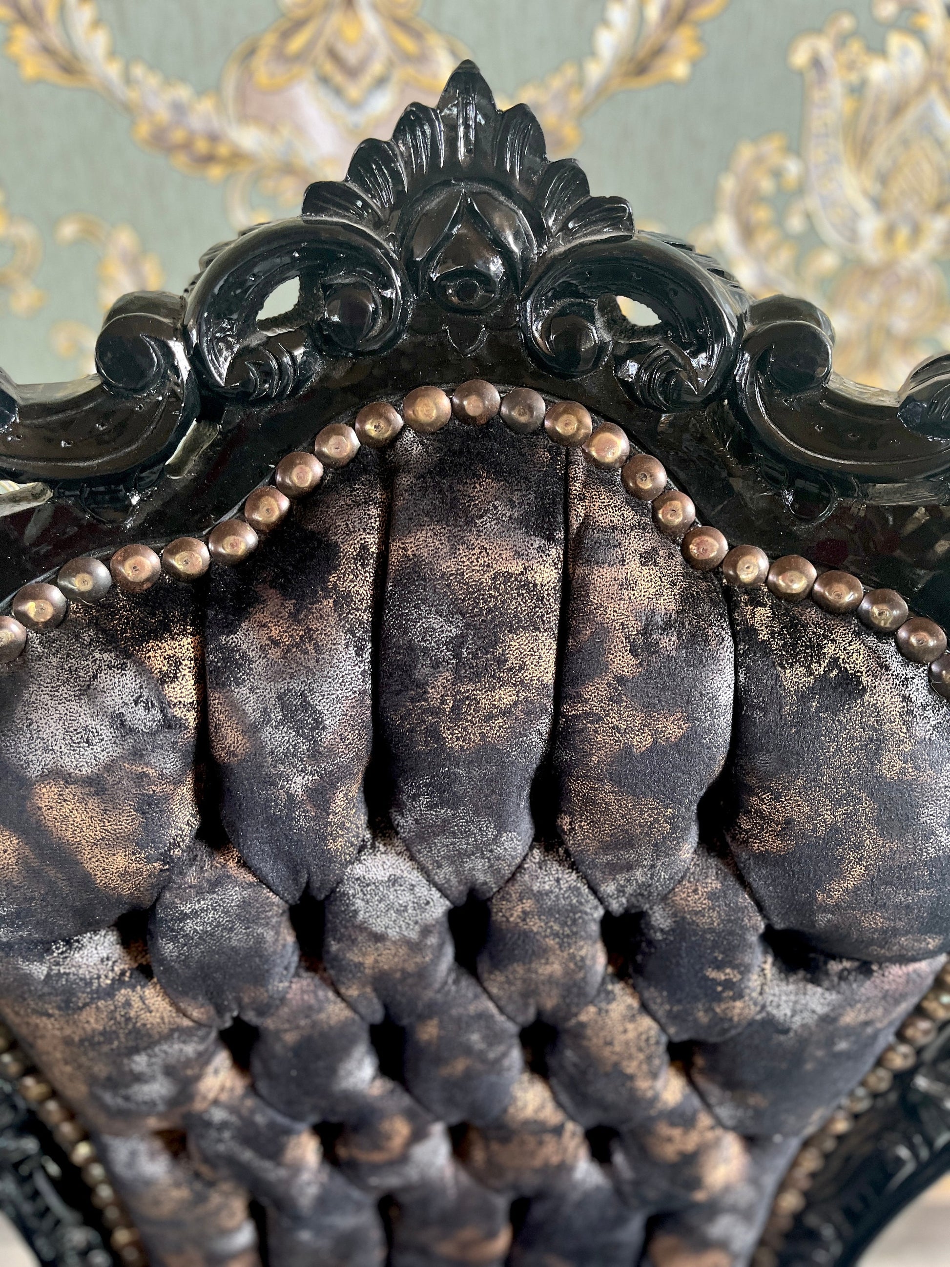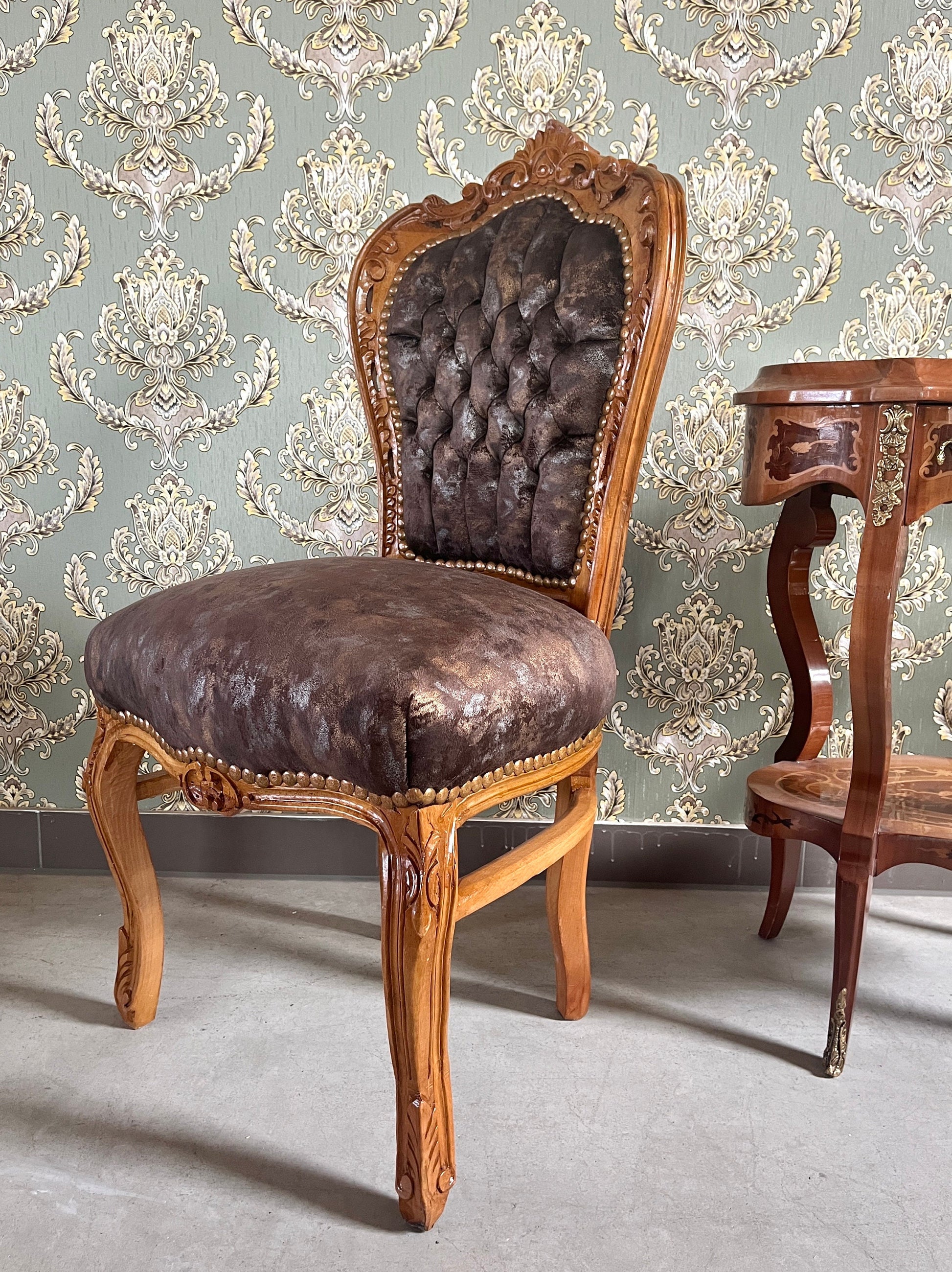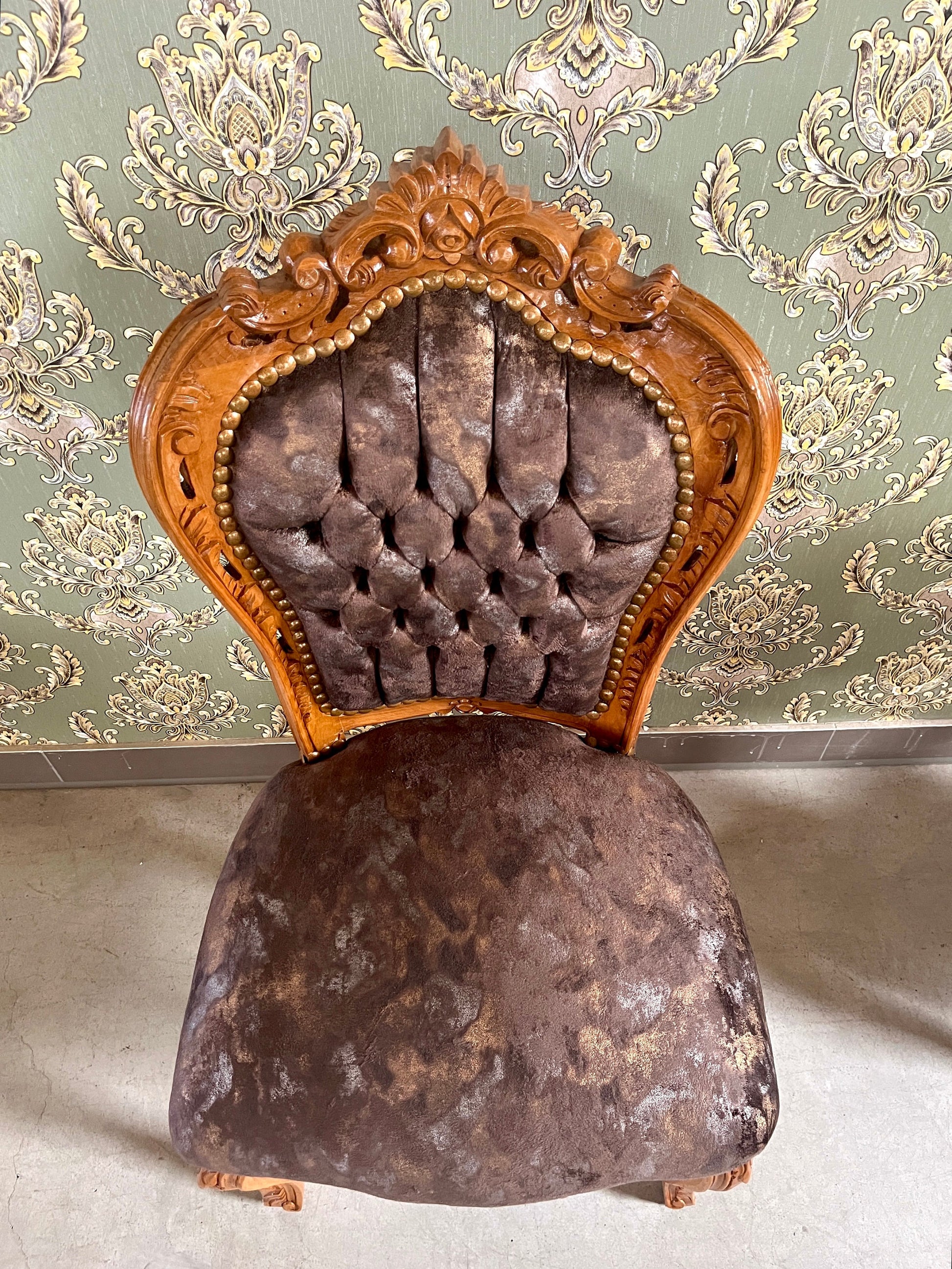 The chair is made of solid beech wood and upholstered with velvet in beautiful patterns and nails firmed to have a retro look.
