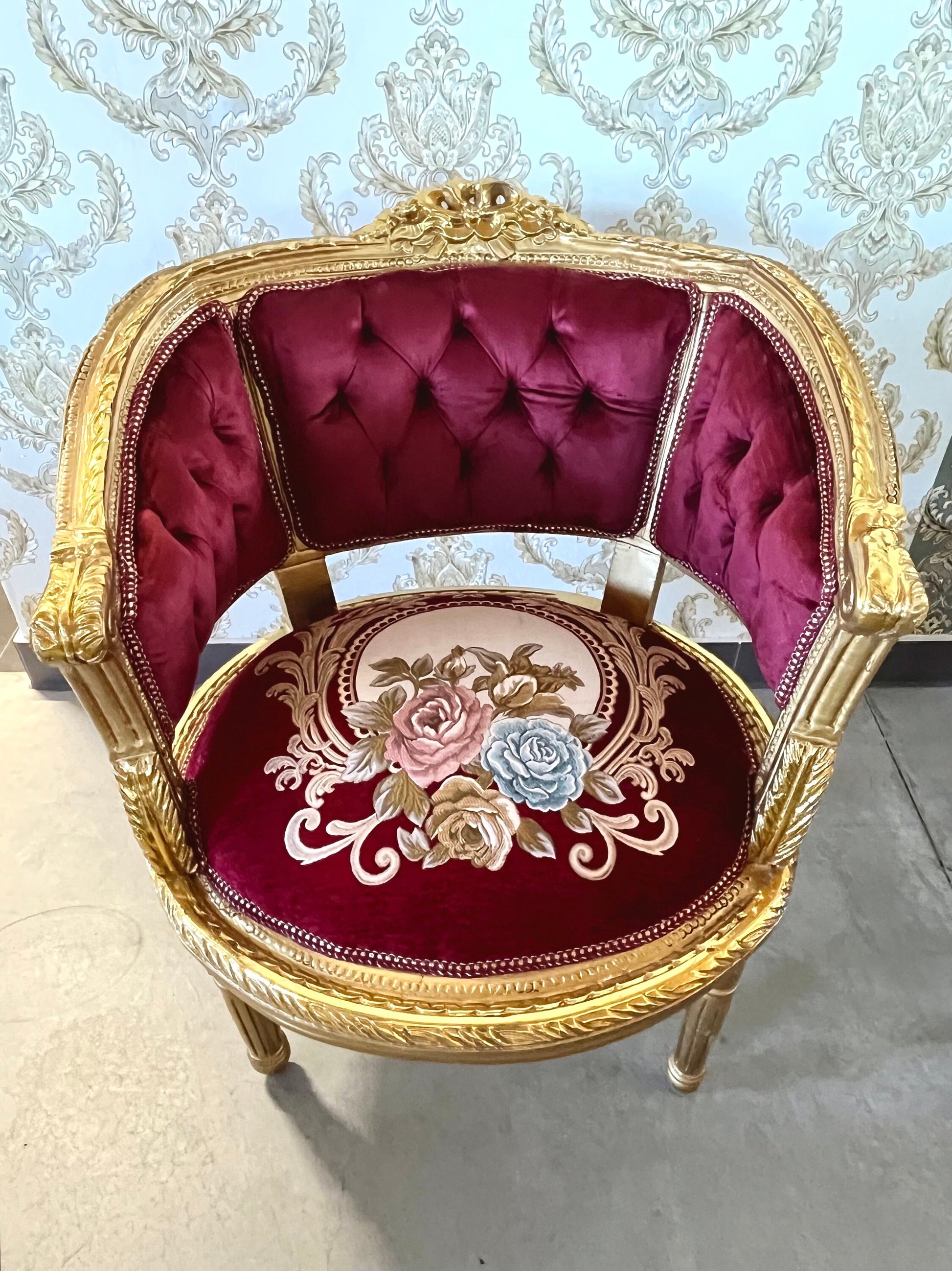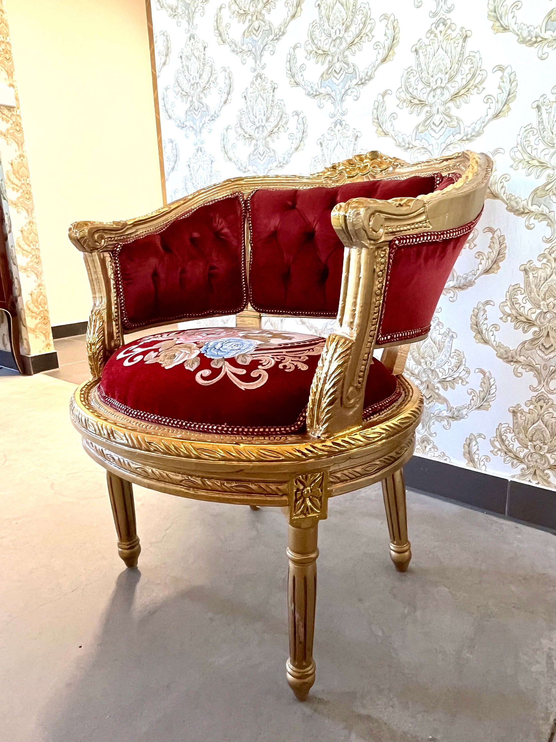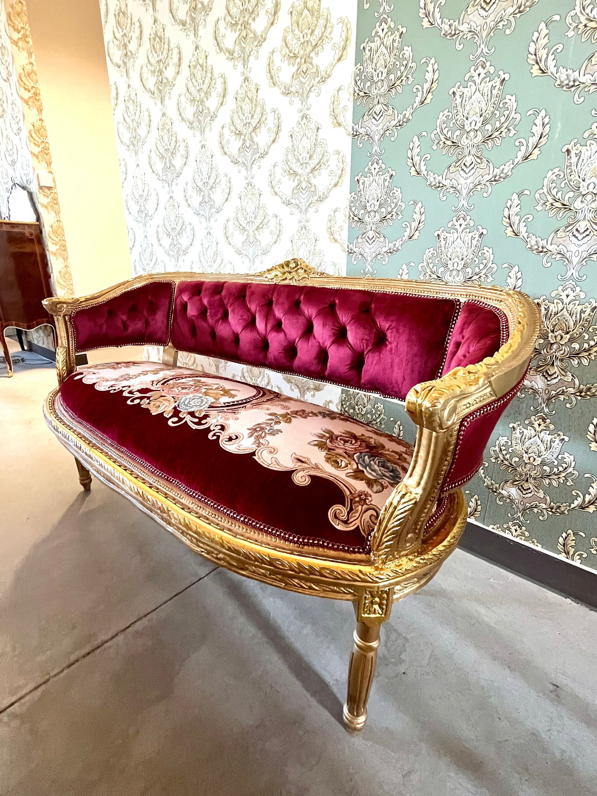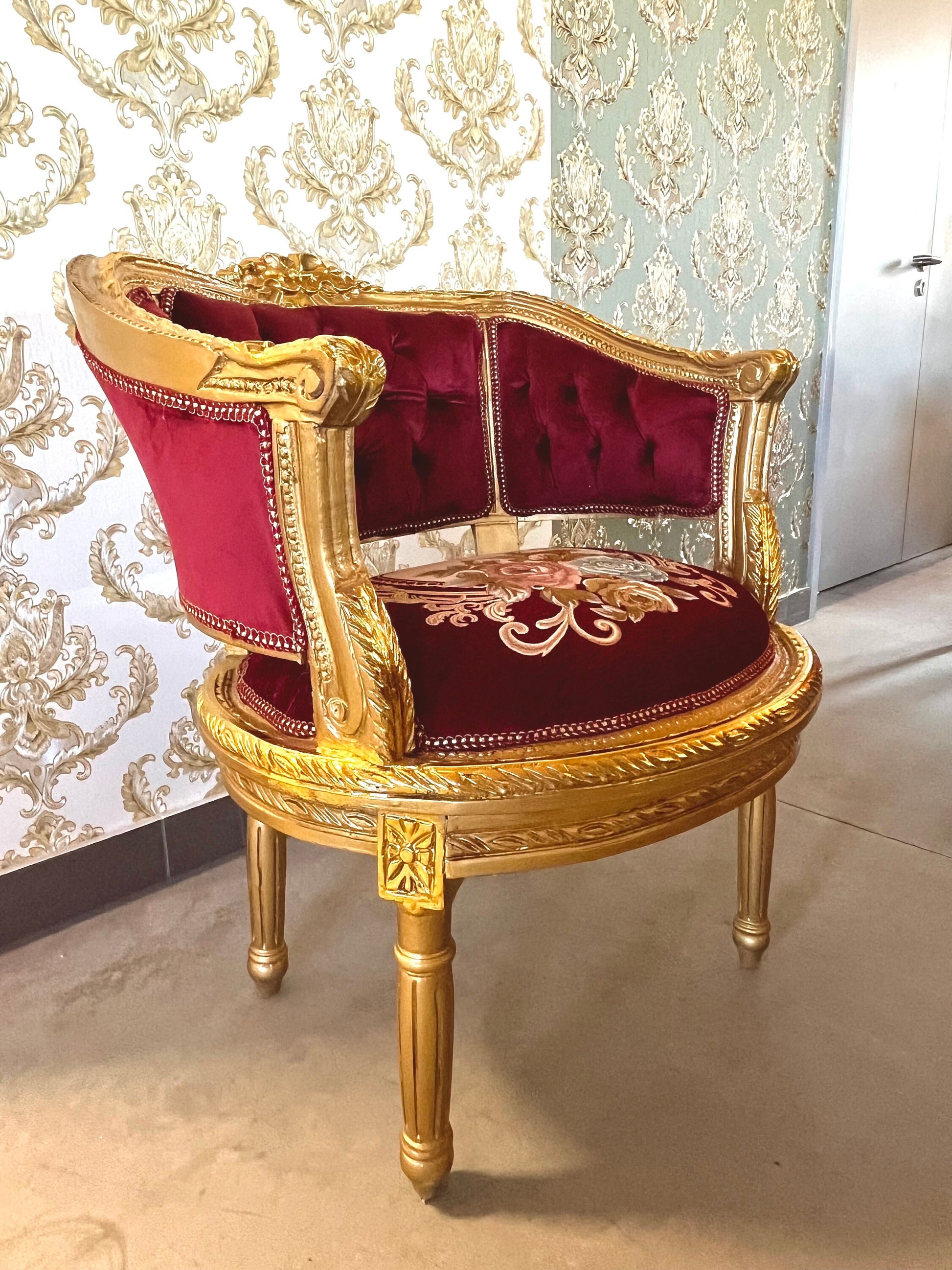 It’s handcrafted from solid beech wood, gilded with gold leaf and upholstered with velvet, silky jacquard fabrics.