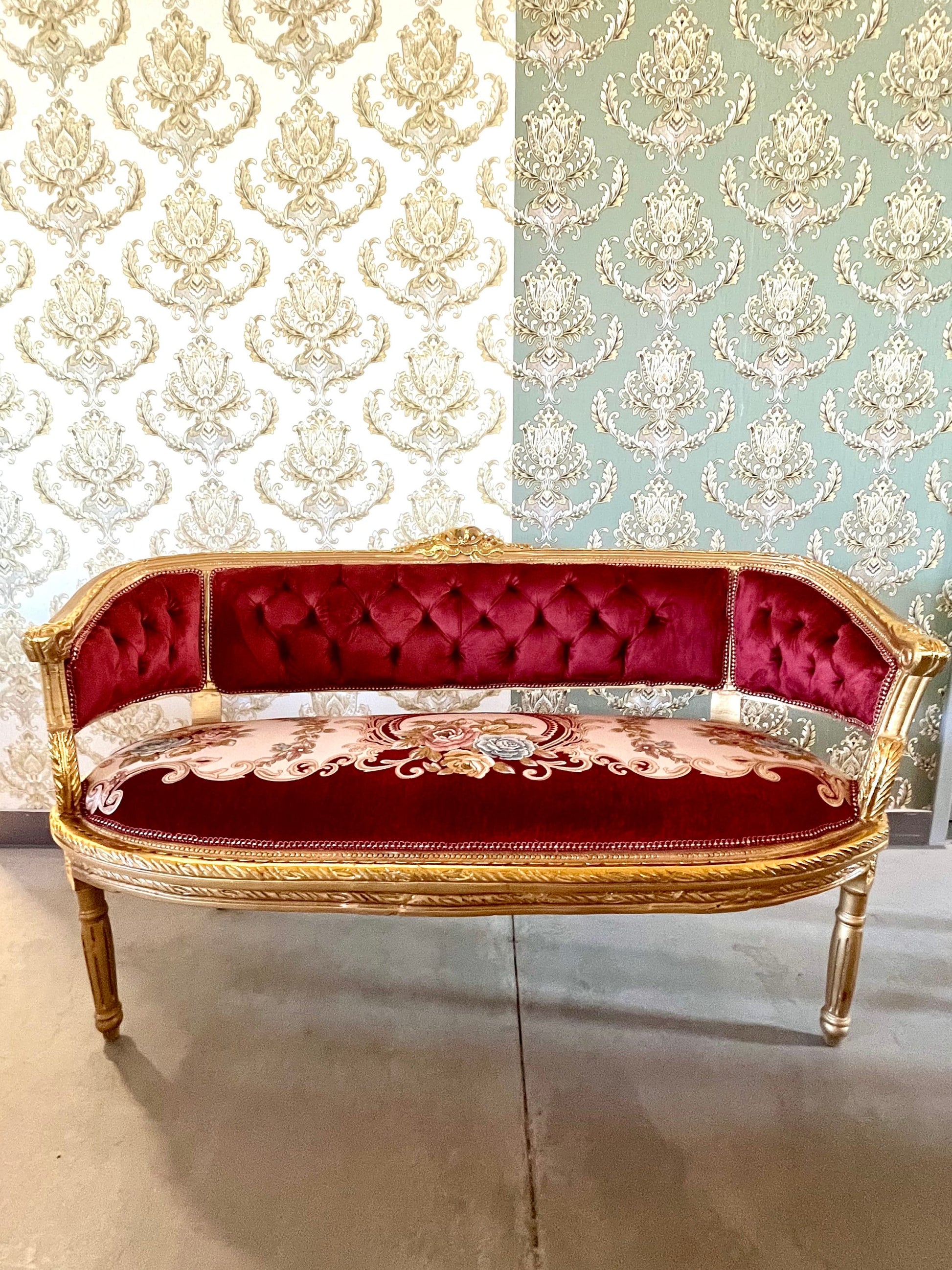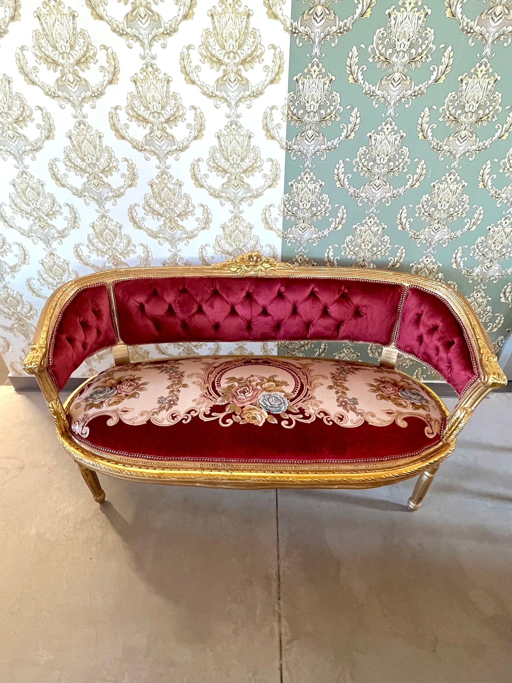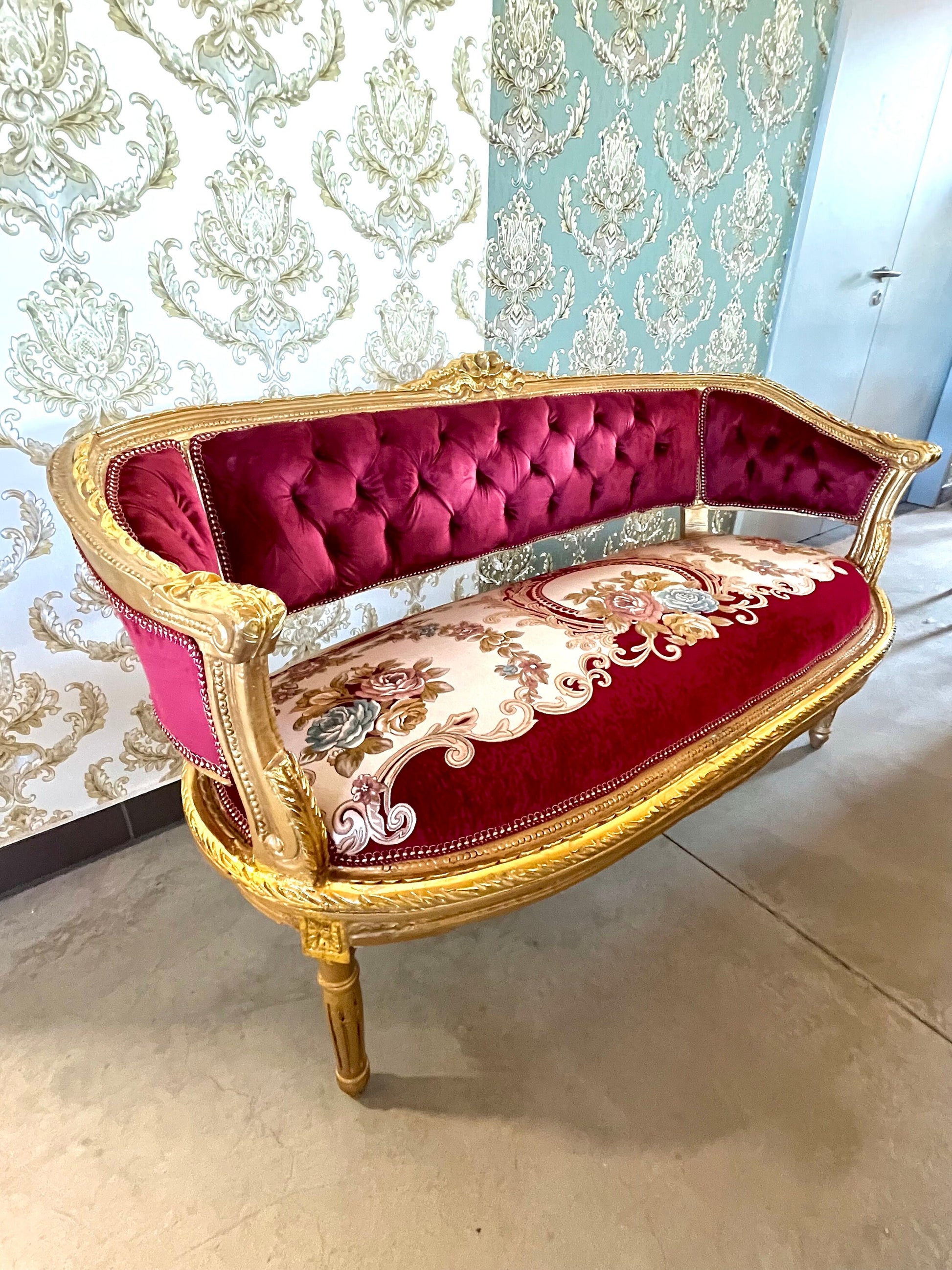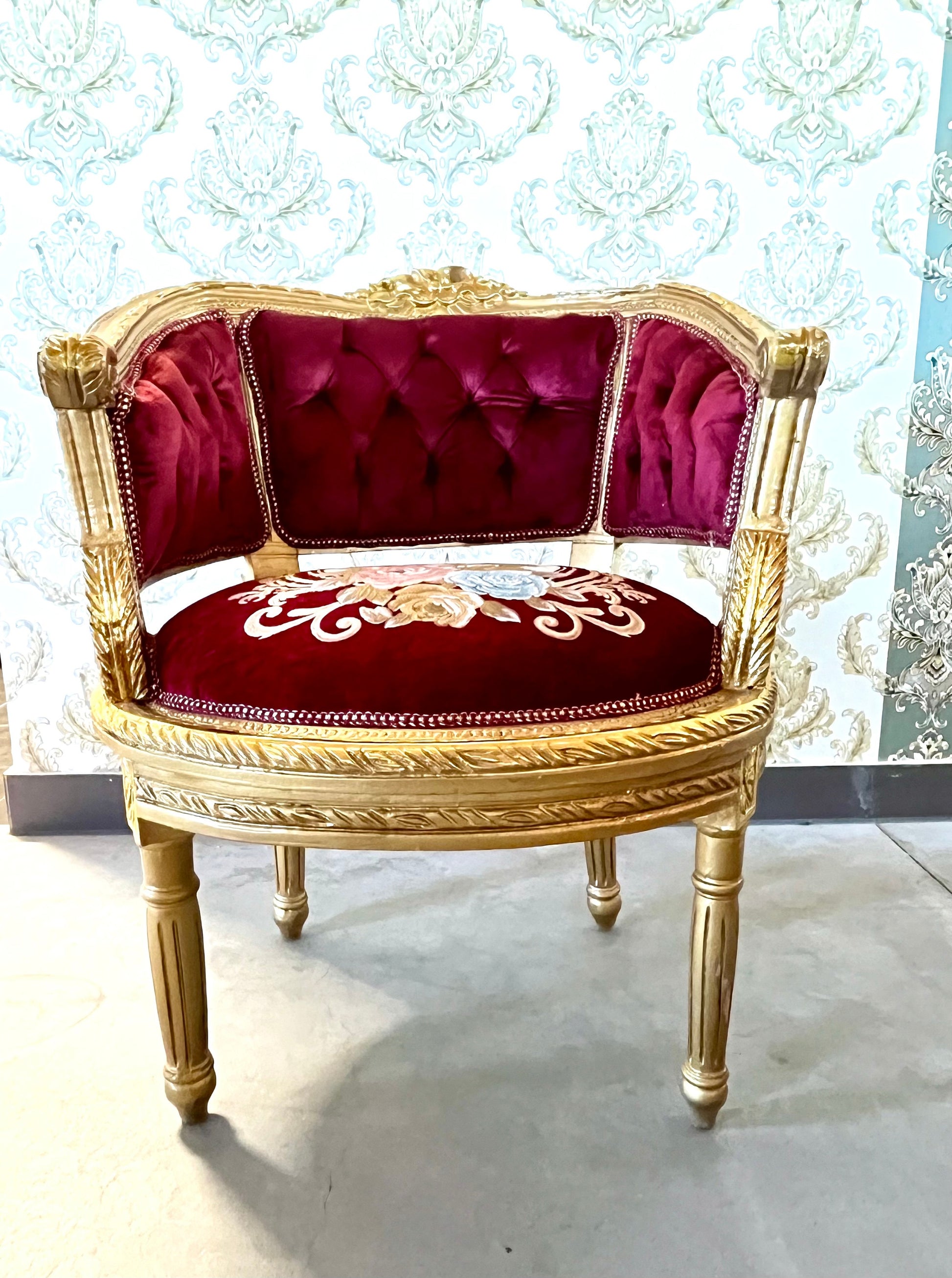 It’s handcrafted from solid beech wood, gilded with gold leaf and upholstered with velvet, silky jacquard fabrics.