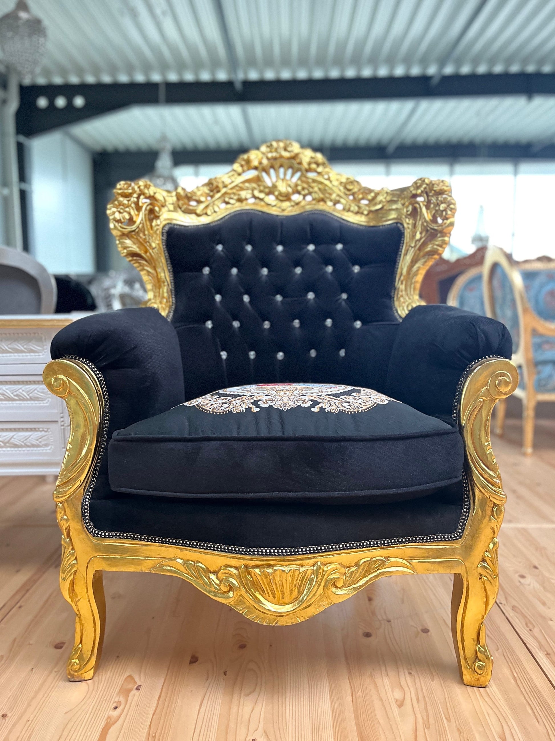 This chic armchair is upholstered with velvet black, handcrafted in solid beech wood and framed in gold foil leaf finished. Very comfortable and sturdy !