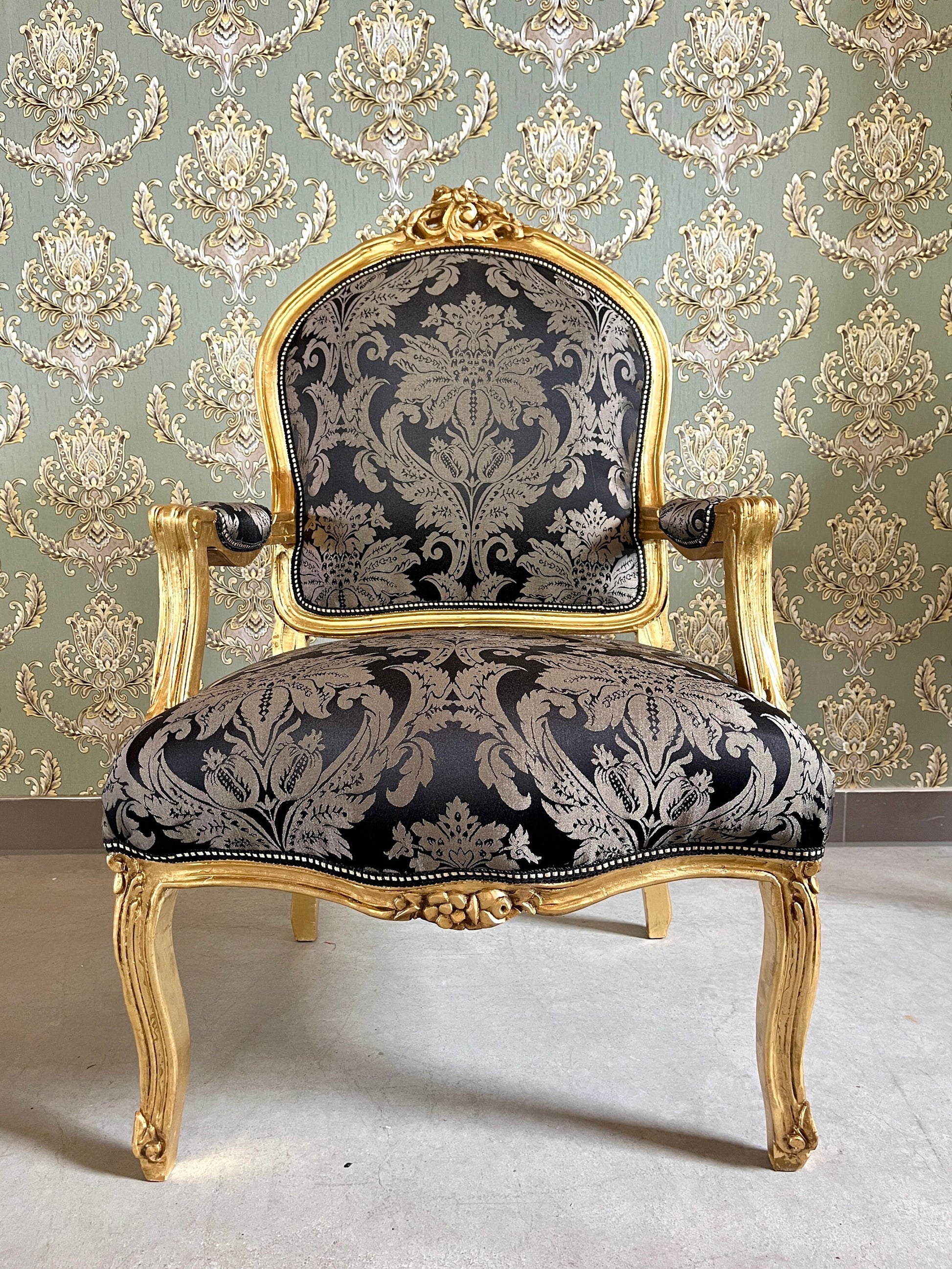 Armchair French Louis Antique Style Chair Royal Baroque Style in Gold Finish Deluxe Fabric in Gold & Black Flower Pattern for Home Décor