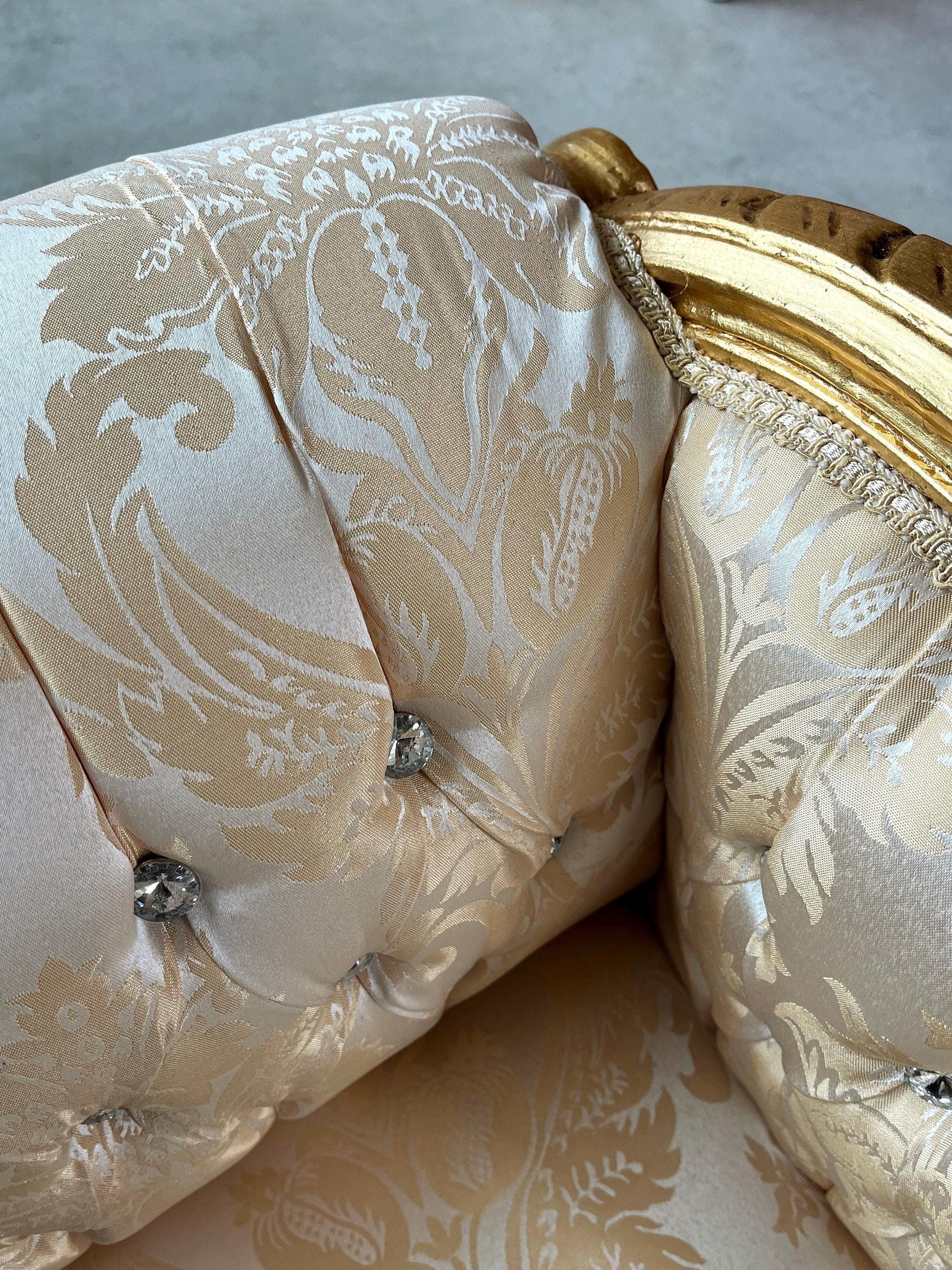 Upholstered with jacquard polyester fabric, handcrafted in solid beech wood and gilded with gold leaf. It’s sturdy, cozy and classic !