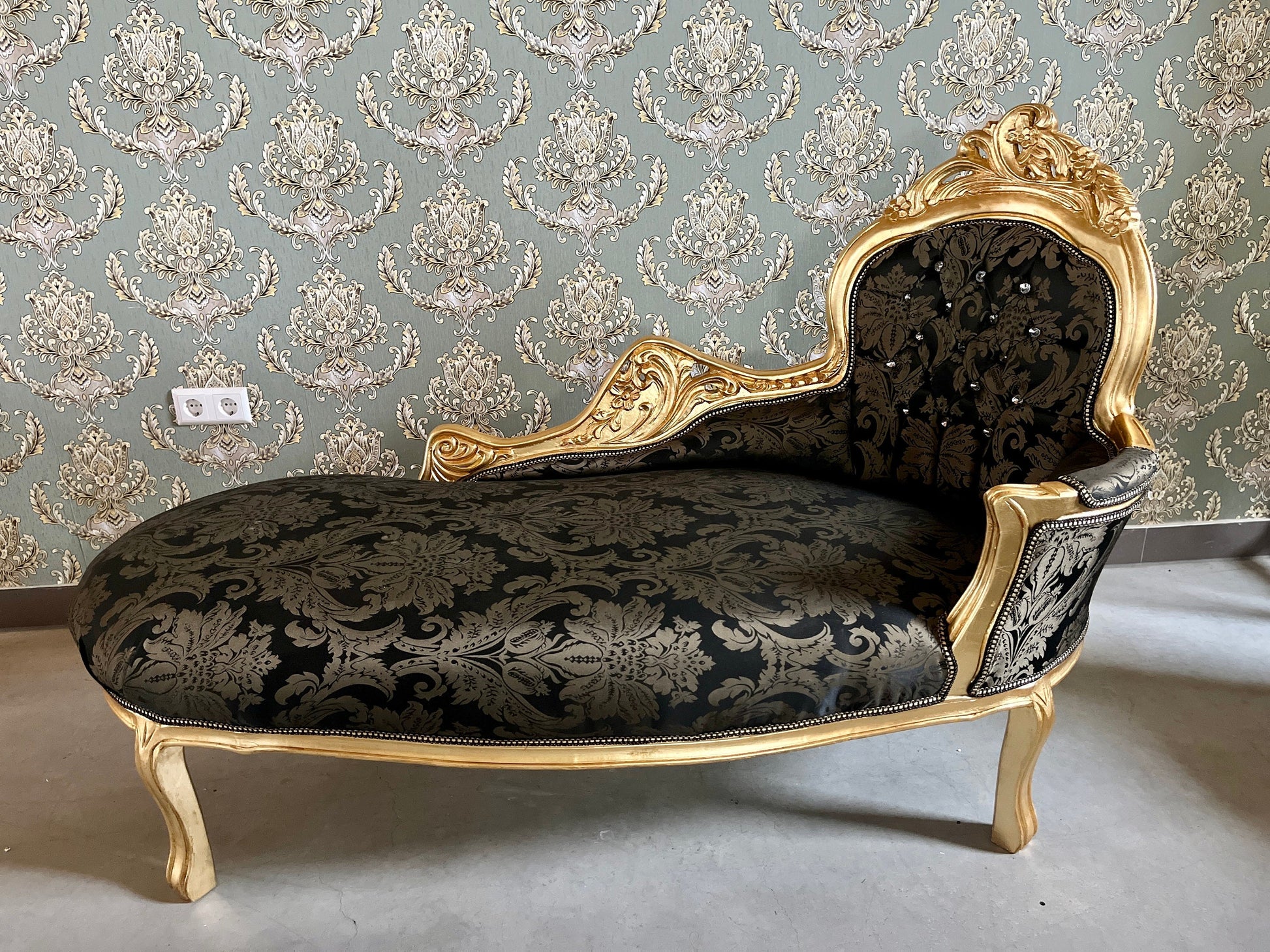 Chaise Longue French Louis Style in Black Floral Fabric Retro Baroque Style Bench in Gold Finish for Home Decor