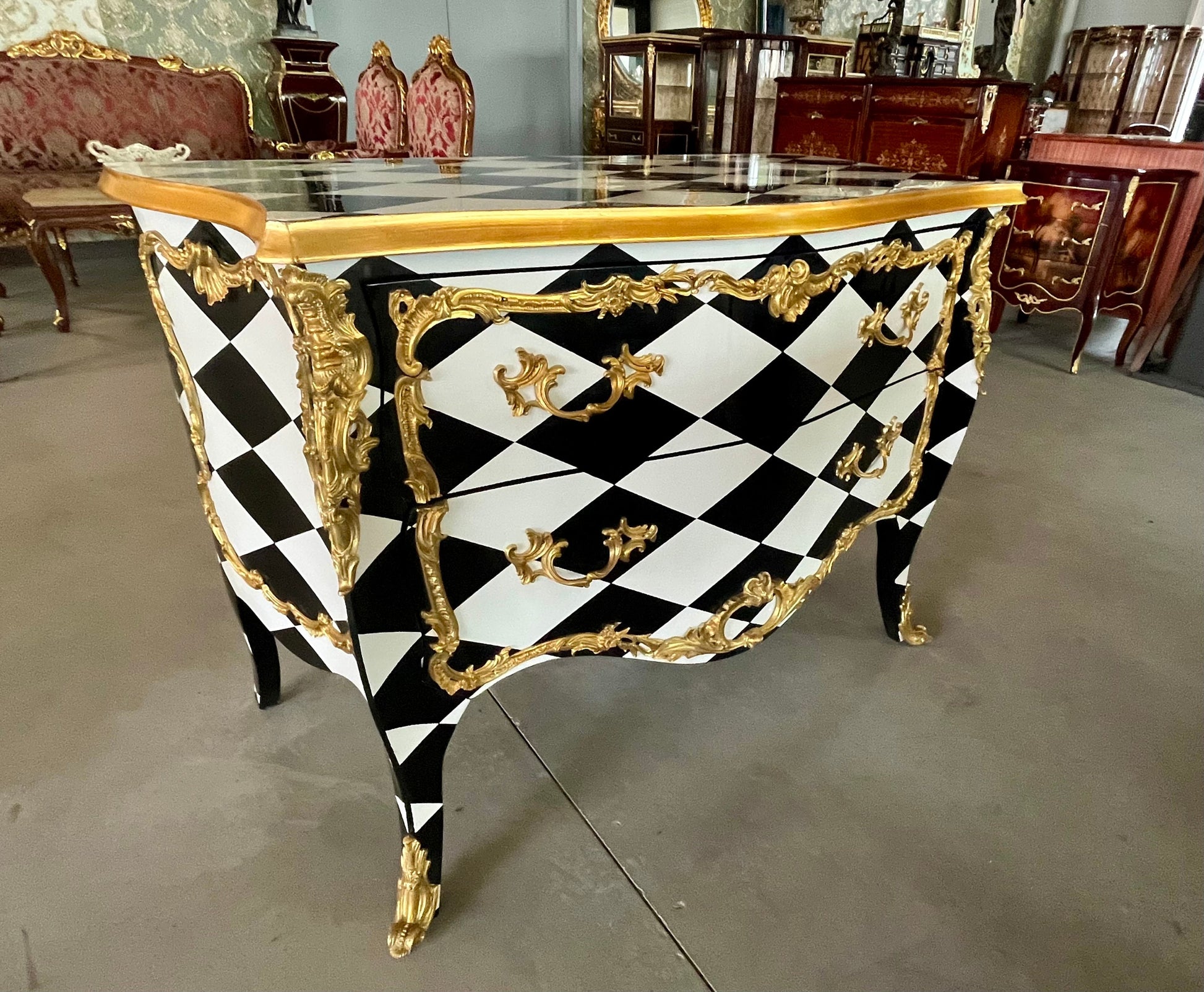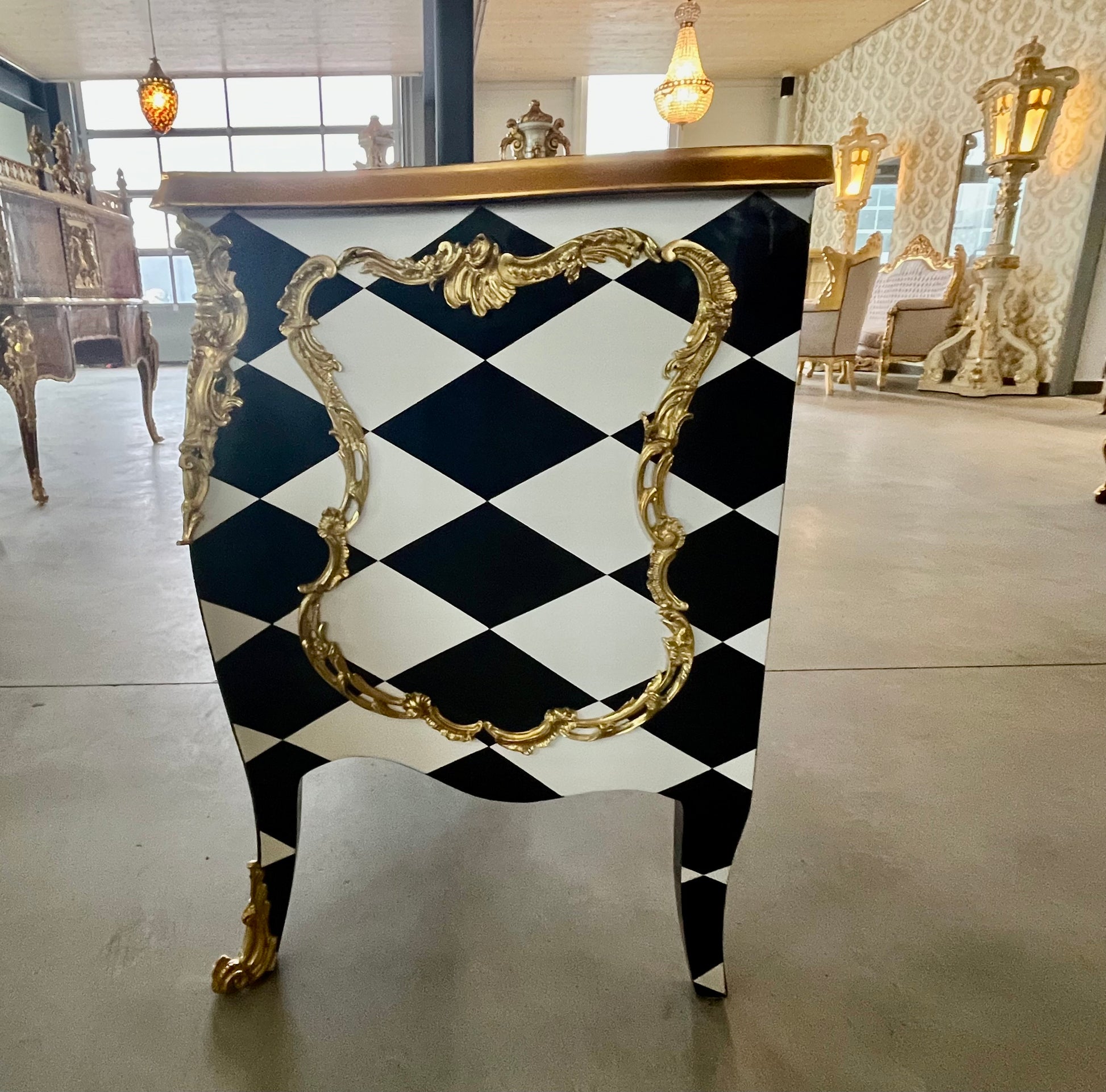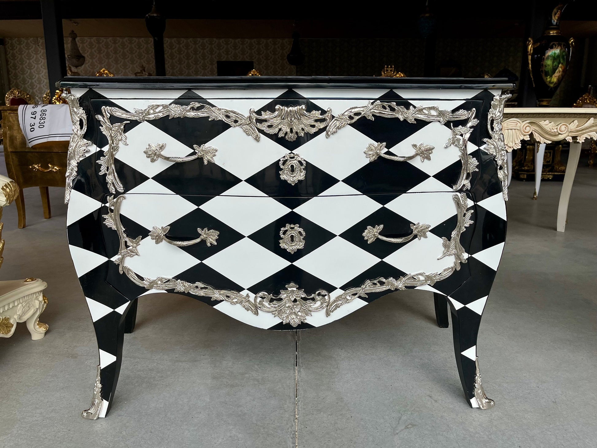 Chest of Drawer Louis XV Style Dresser in Black Diamond Print Chest of Drawer Retro Baroque Style with Brass Ornaments for Bedroom Decor