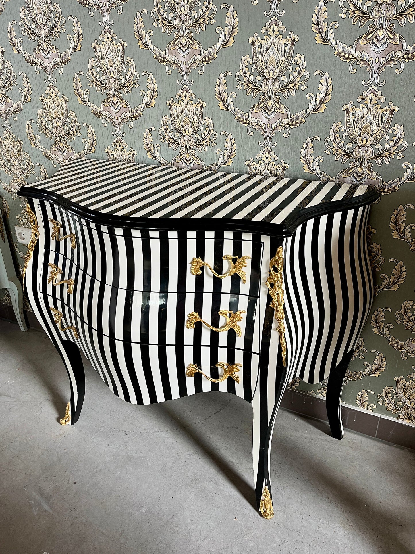 Deluxe wooden chest of drawer in black stripe. This classic style is from French Louis XVI reproduction with bronze handles and inlaid with 3 drawers.