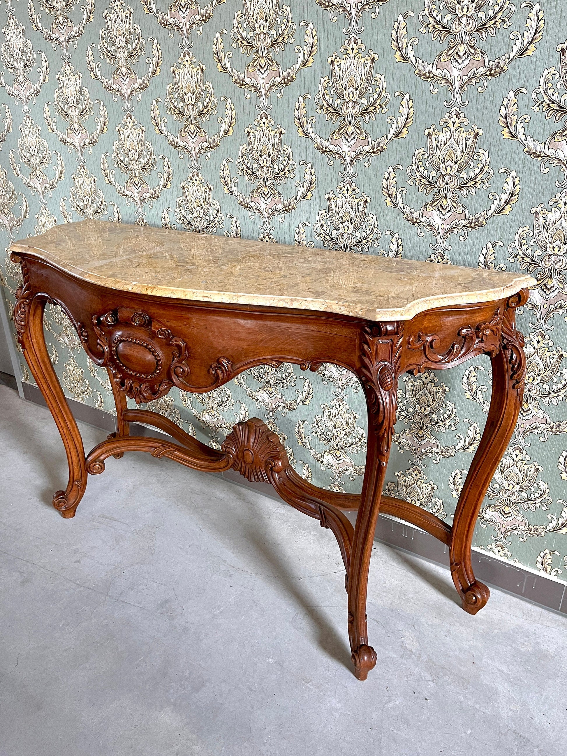 Console Table French Antique Style in Solid Wood Brown and Marble Slab Top Table Retro Baroque Style Gorgeous for Home Decor