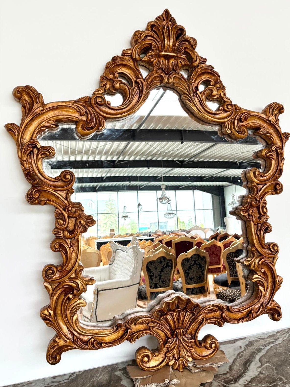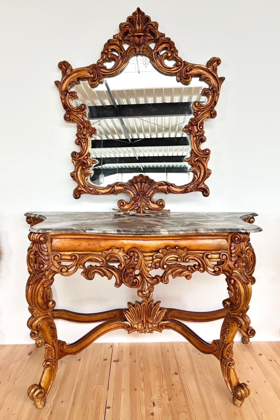 Console Table Mirror French Antique Style with Grey Marble Slab Top Console Table Retro Baroque Rococo Style in Gold Finish for Home Decor
