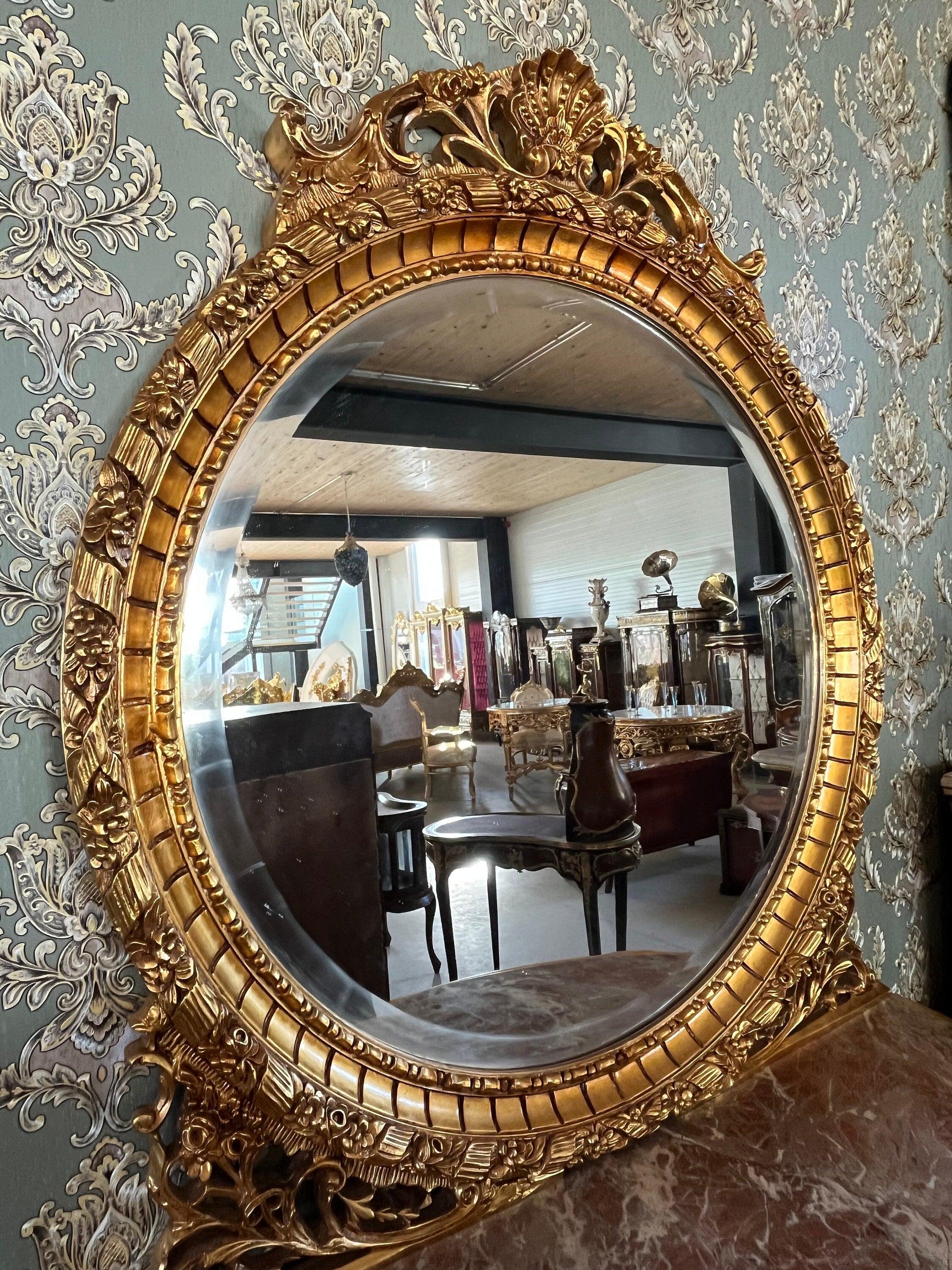 A empire deluxe baroque style console in reproduction; including a round mirror and a tall table with a marble slab on top. Definitely a noble piece 💯