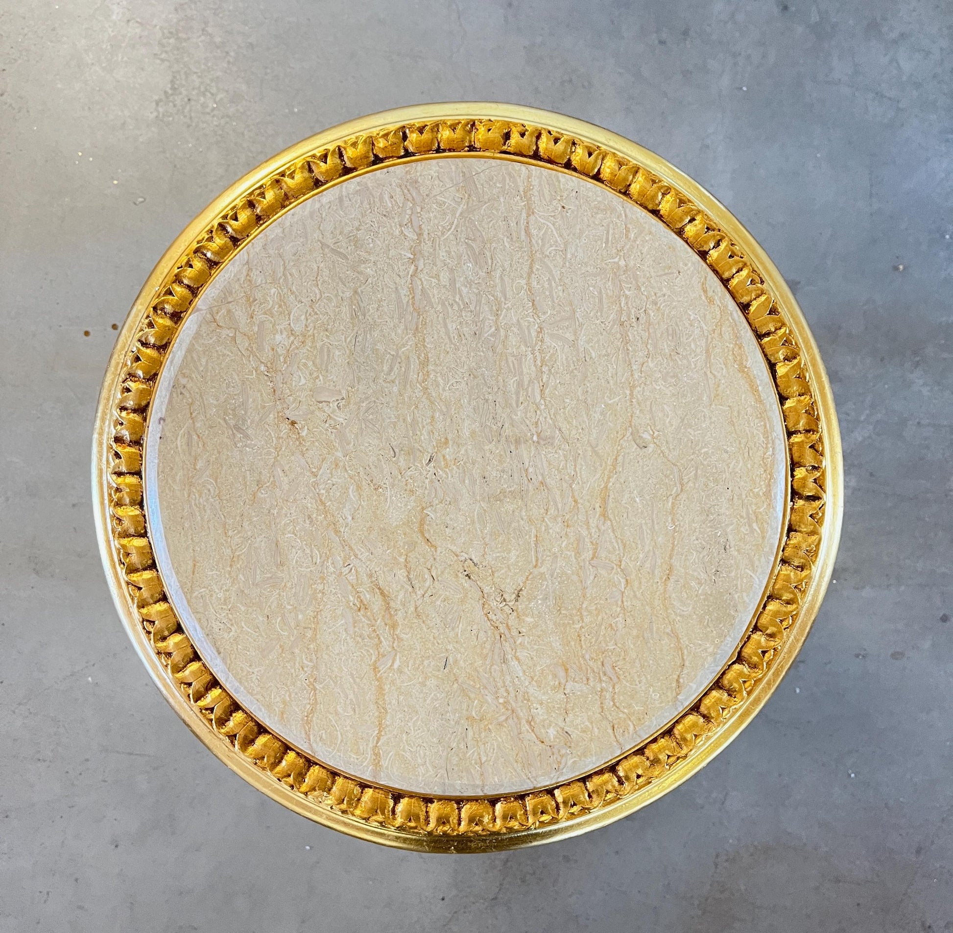 The side table with a marble slab top and 2 small armchairs are made of solid beech wood and upholstered in silky polyester jacquard fabric in beige color.