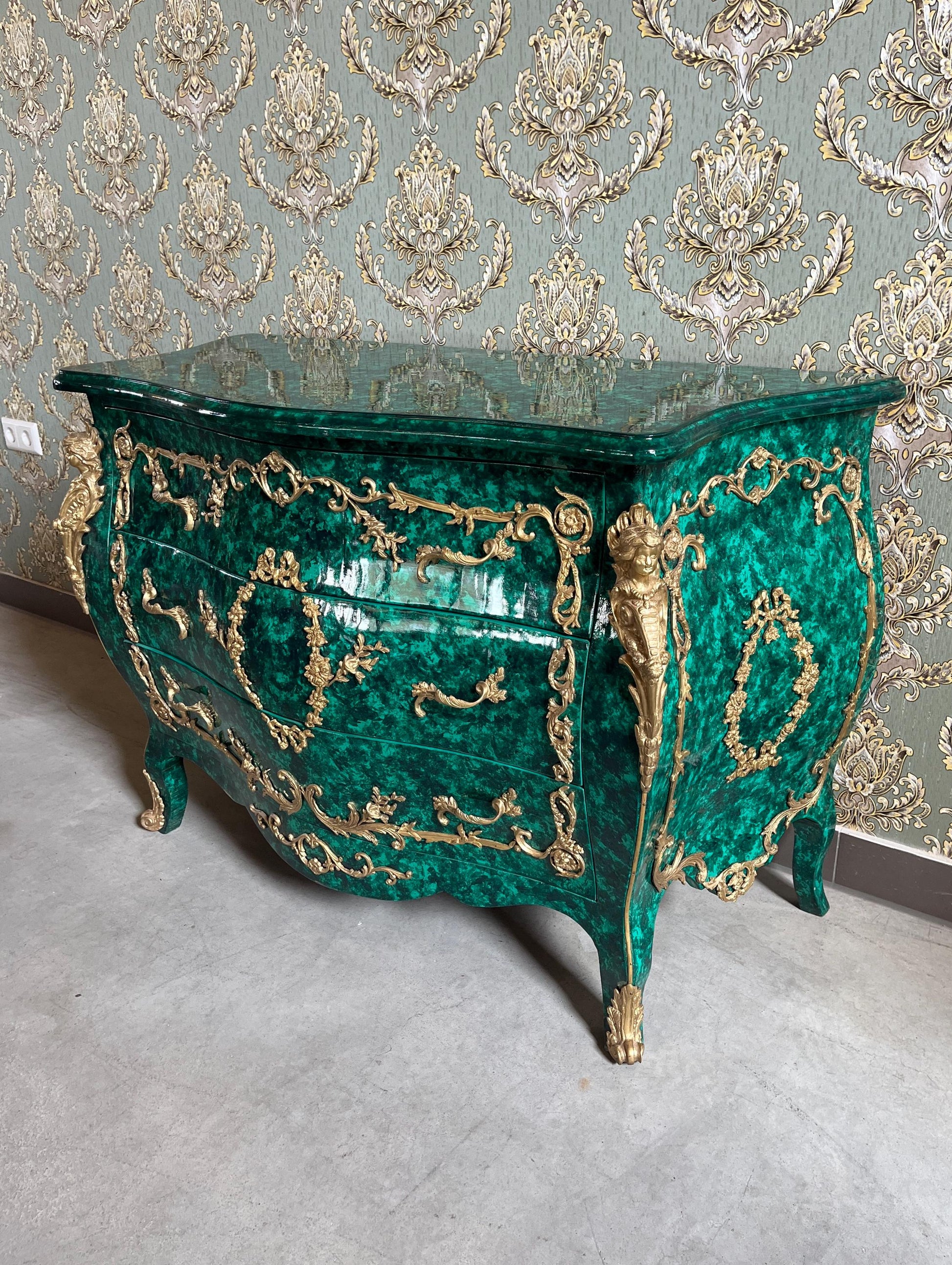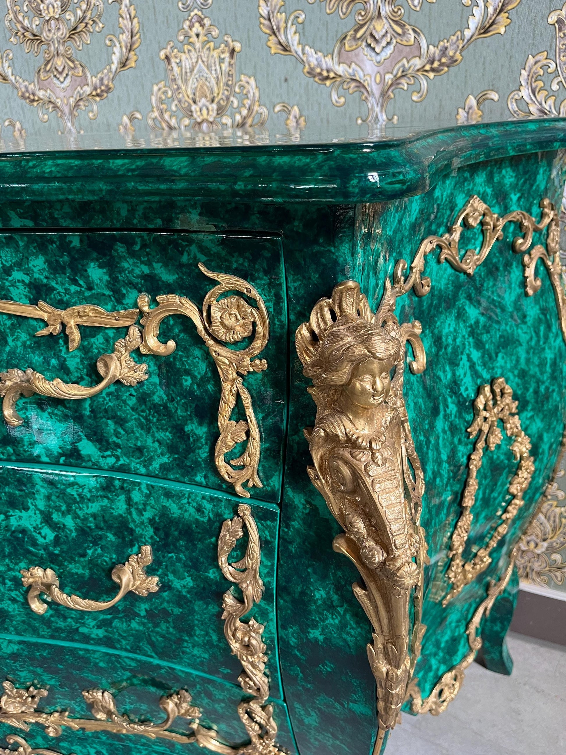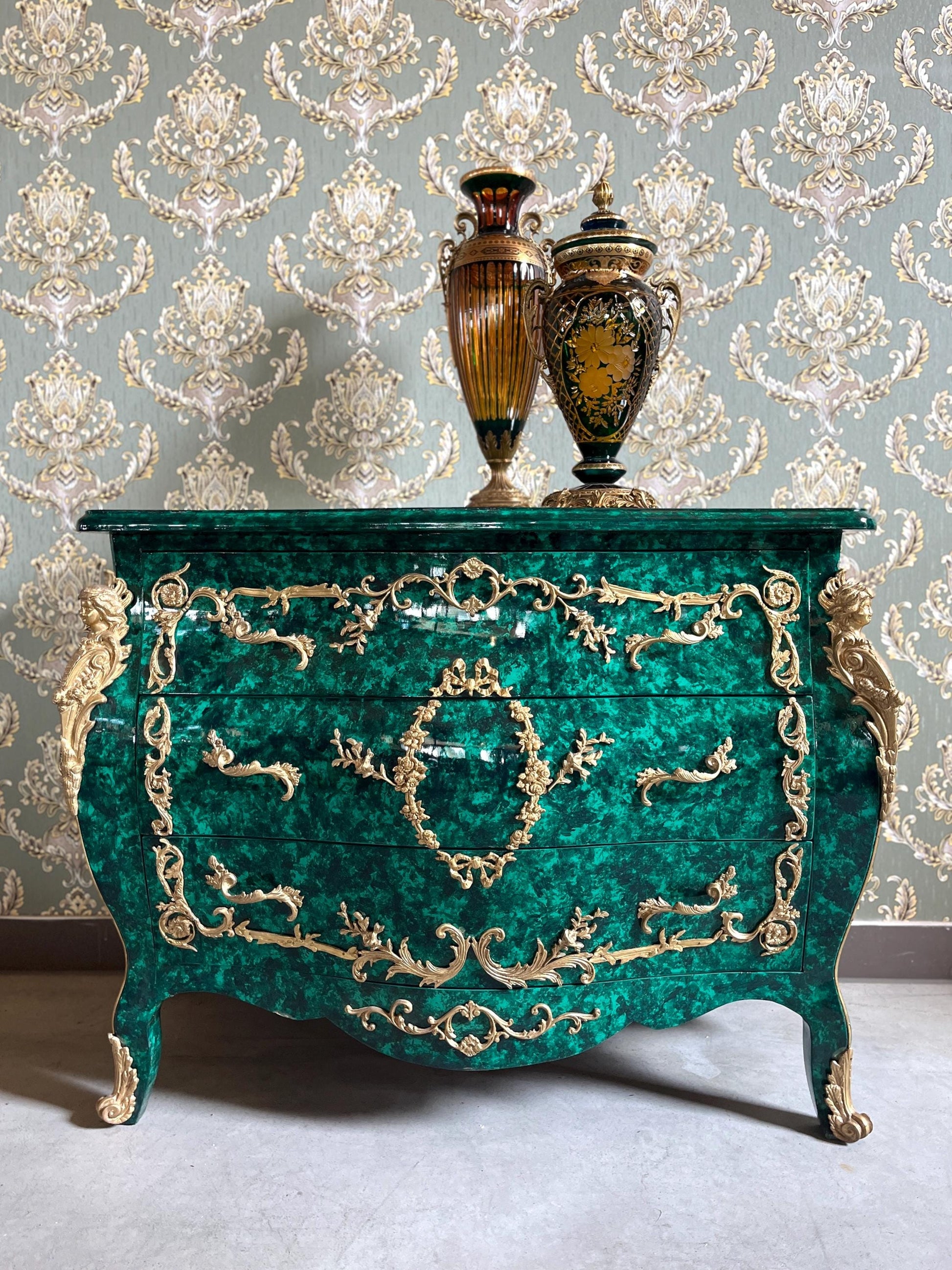 Deluxe Chest of Drawer Louis XV Style in Emerald Green Antique Royal Style Dresser with Bronze Ornaments for Bedroom Decor- LIMITED EDITION