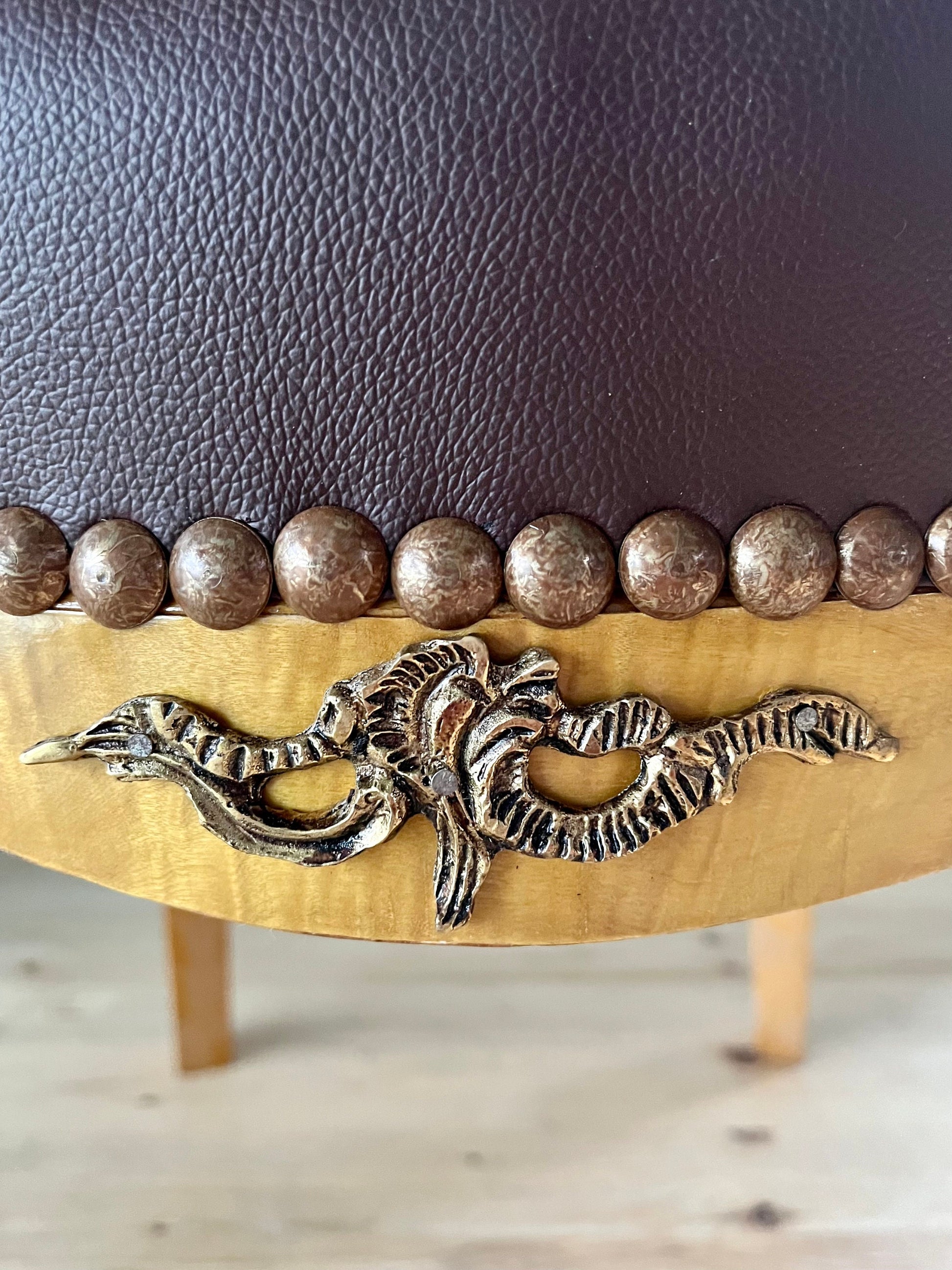 The chair is made of solid beech wood in yellow frame and upholstered in brown faux leather and nails firmed to have a retro look.