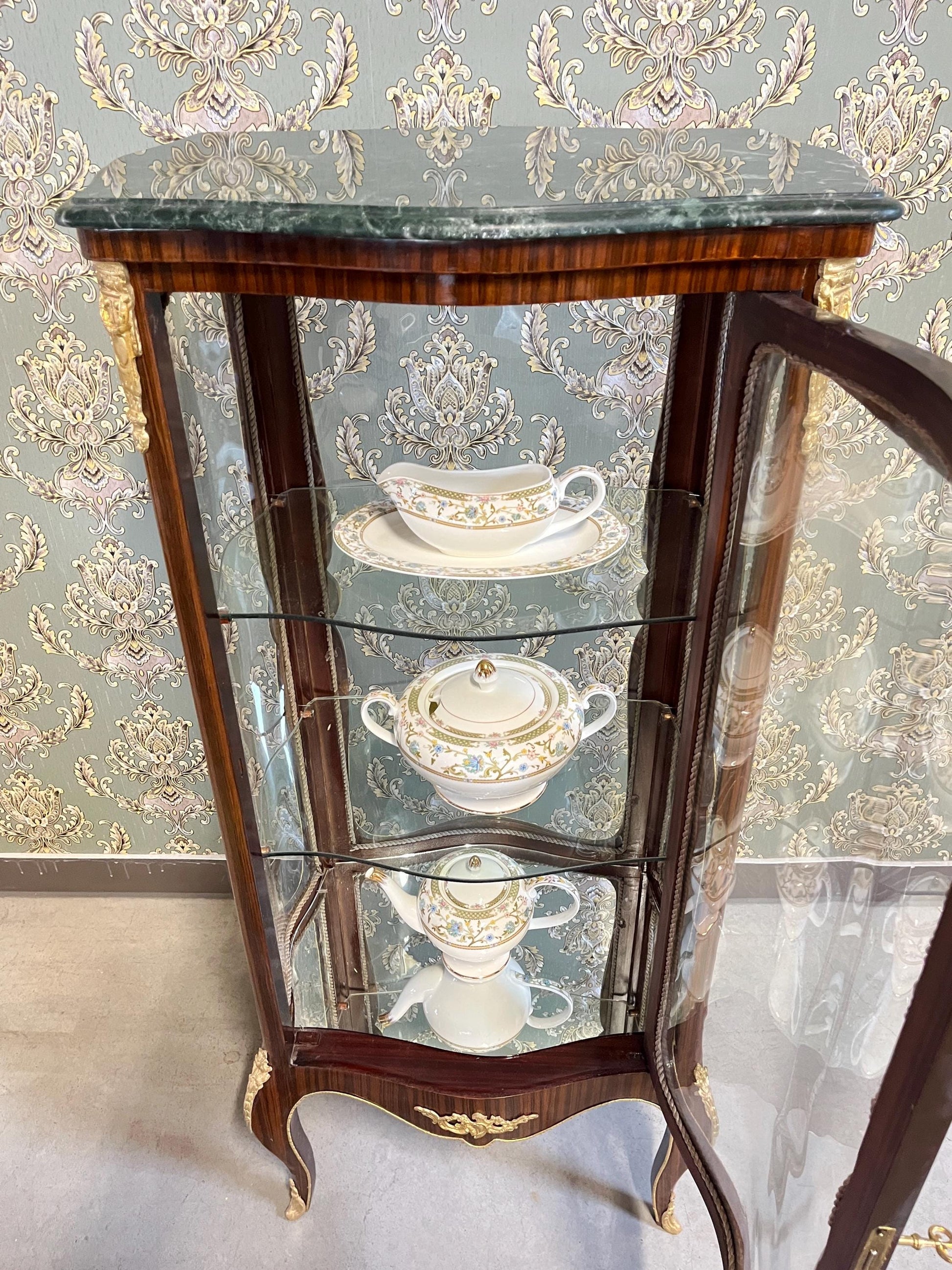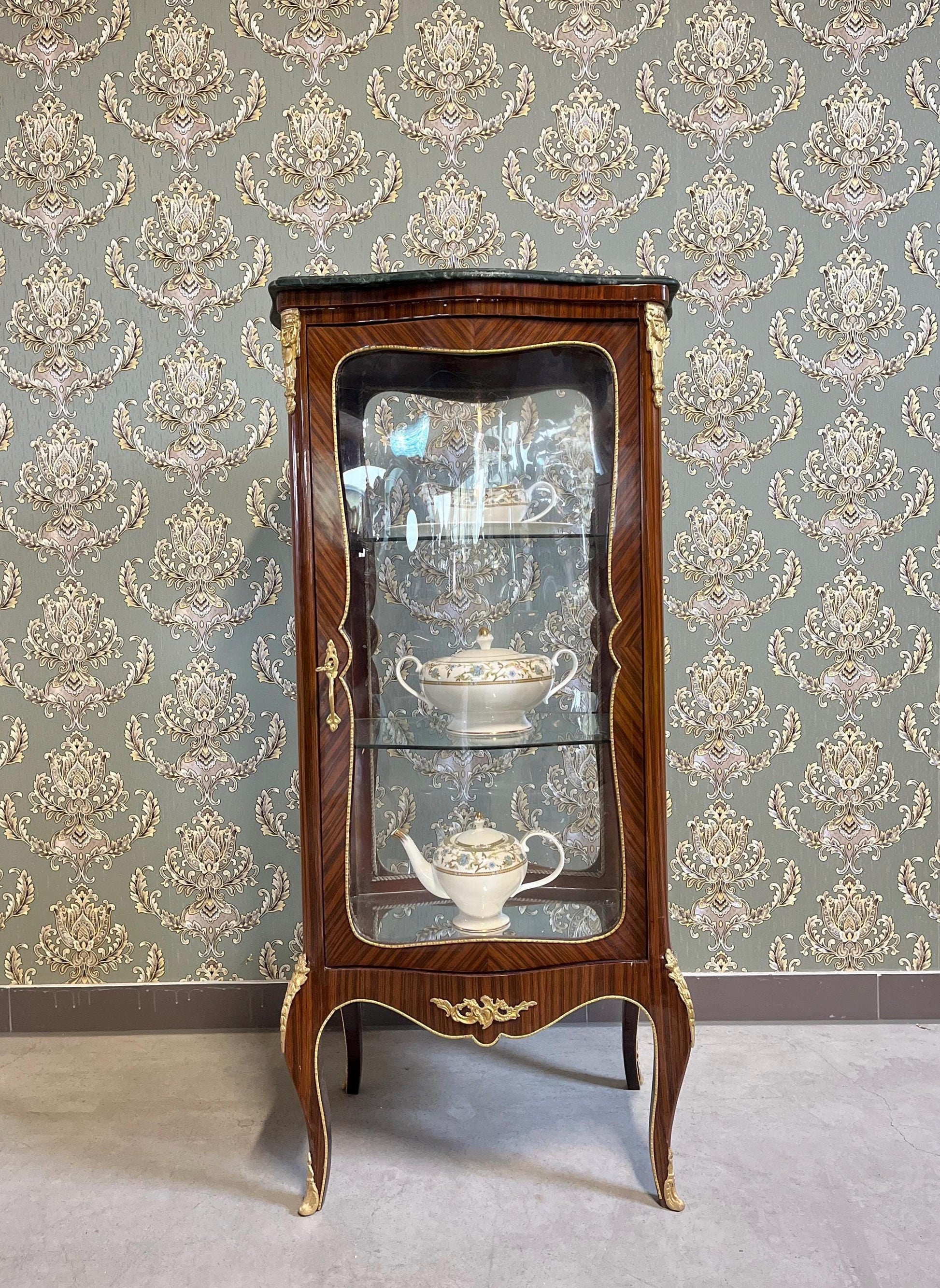 It’s French Louis baroque style in reproduction. This 3-shelf showcase is handcrafted in solid wood, glass door and bronze ornaments.