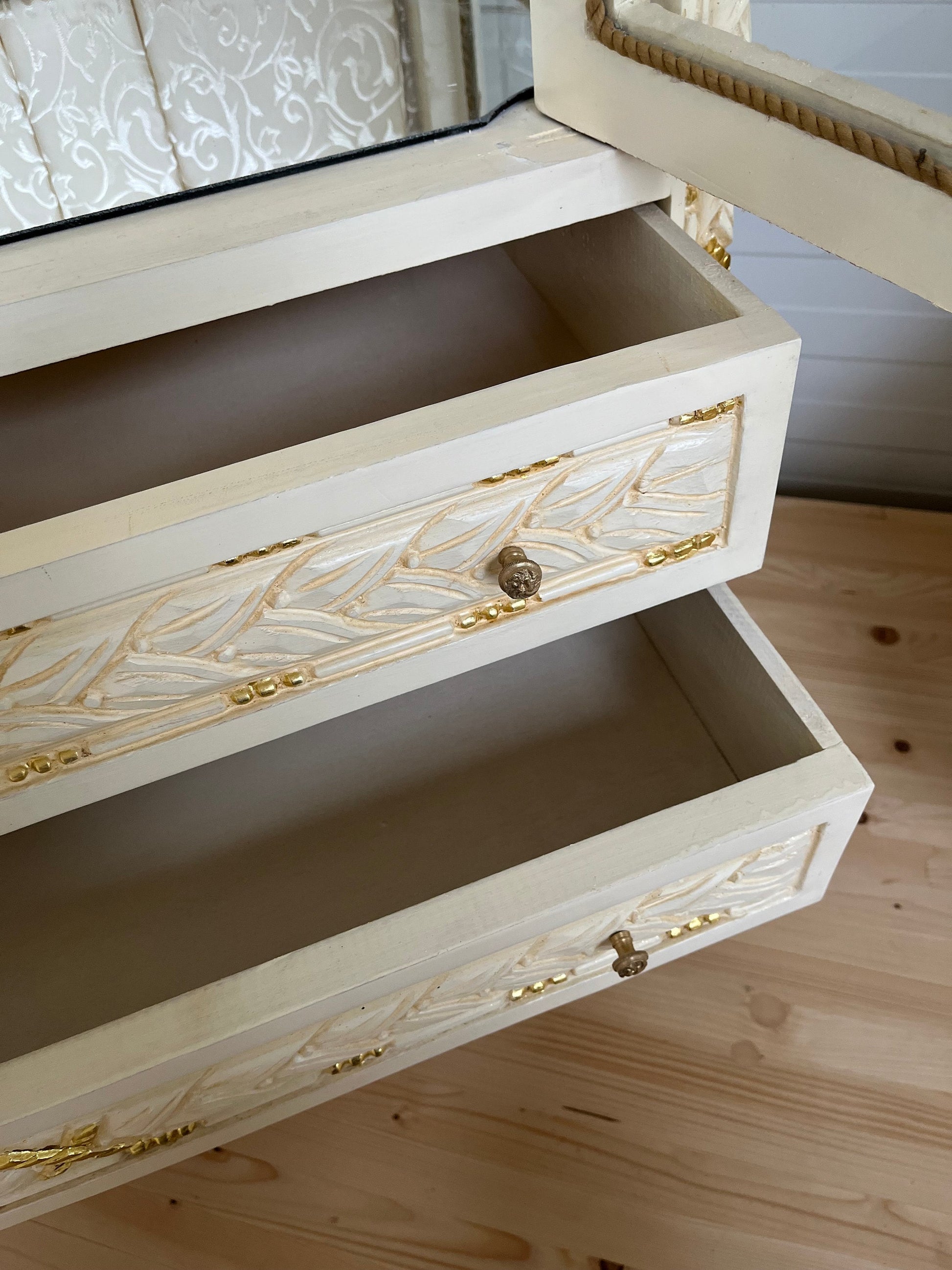 It’s French Louis baroque style in reproduction. Handcrafted in solid wood, upholstered with satin-like jacquard fabric & decorative crystals are spotlight!