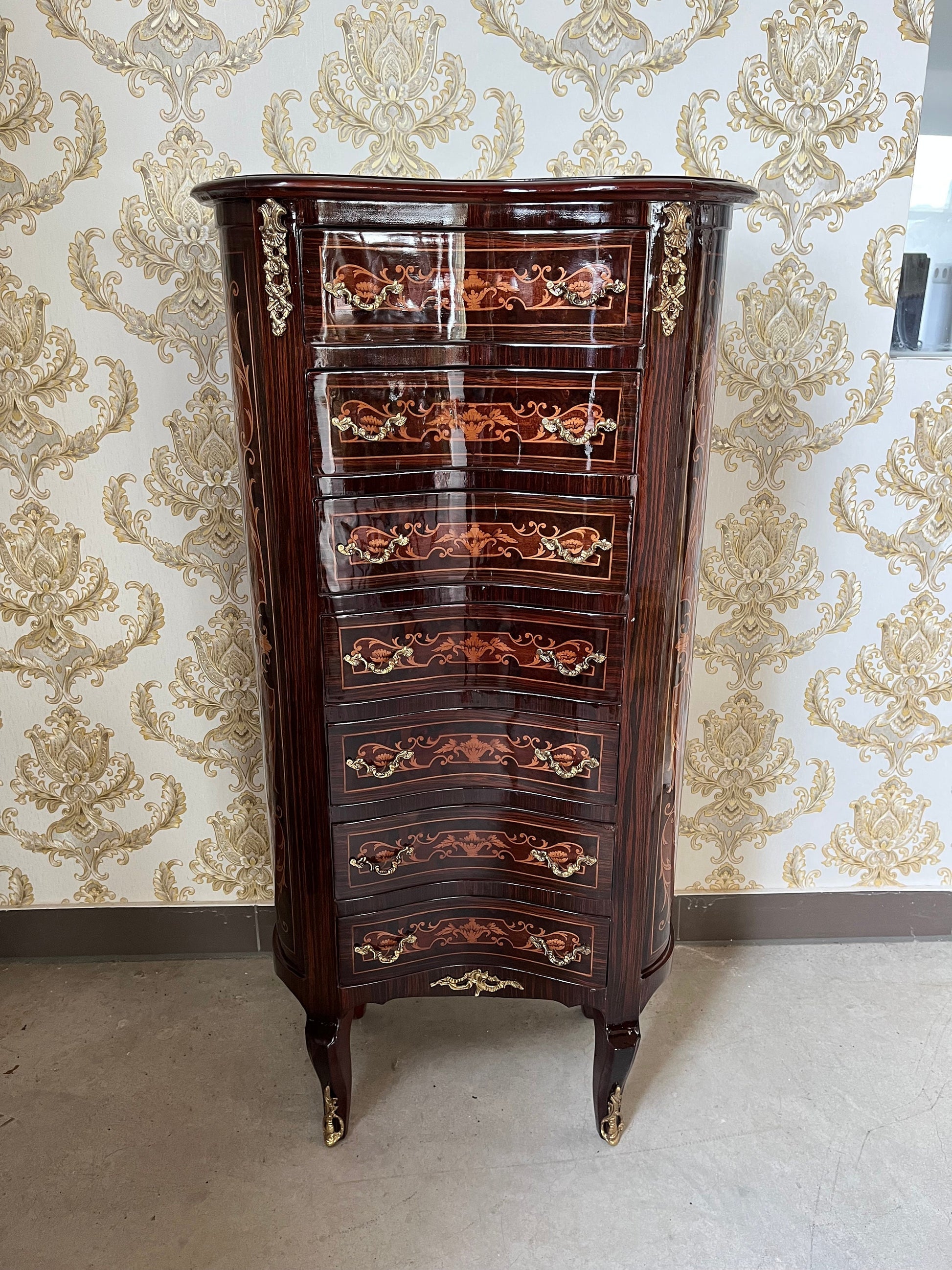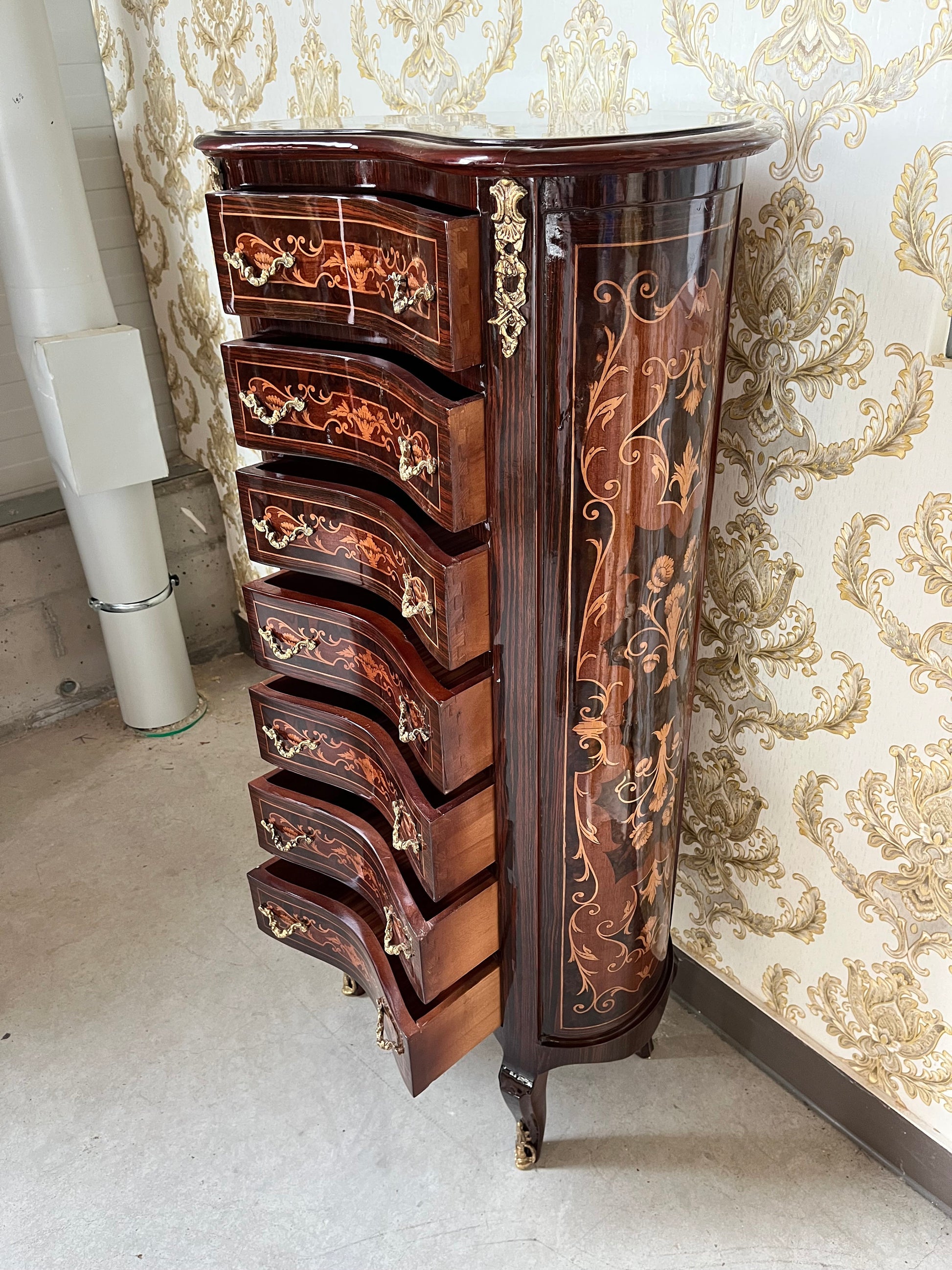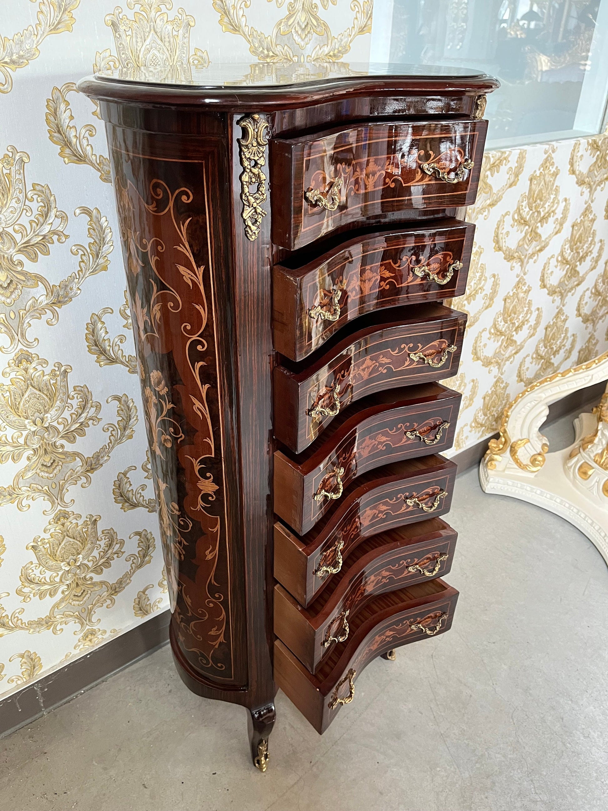 Curved tall chest of drawer inlaid with 7 drawers. This beautiful style is from French Louis XVI in reproduction.