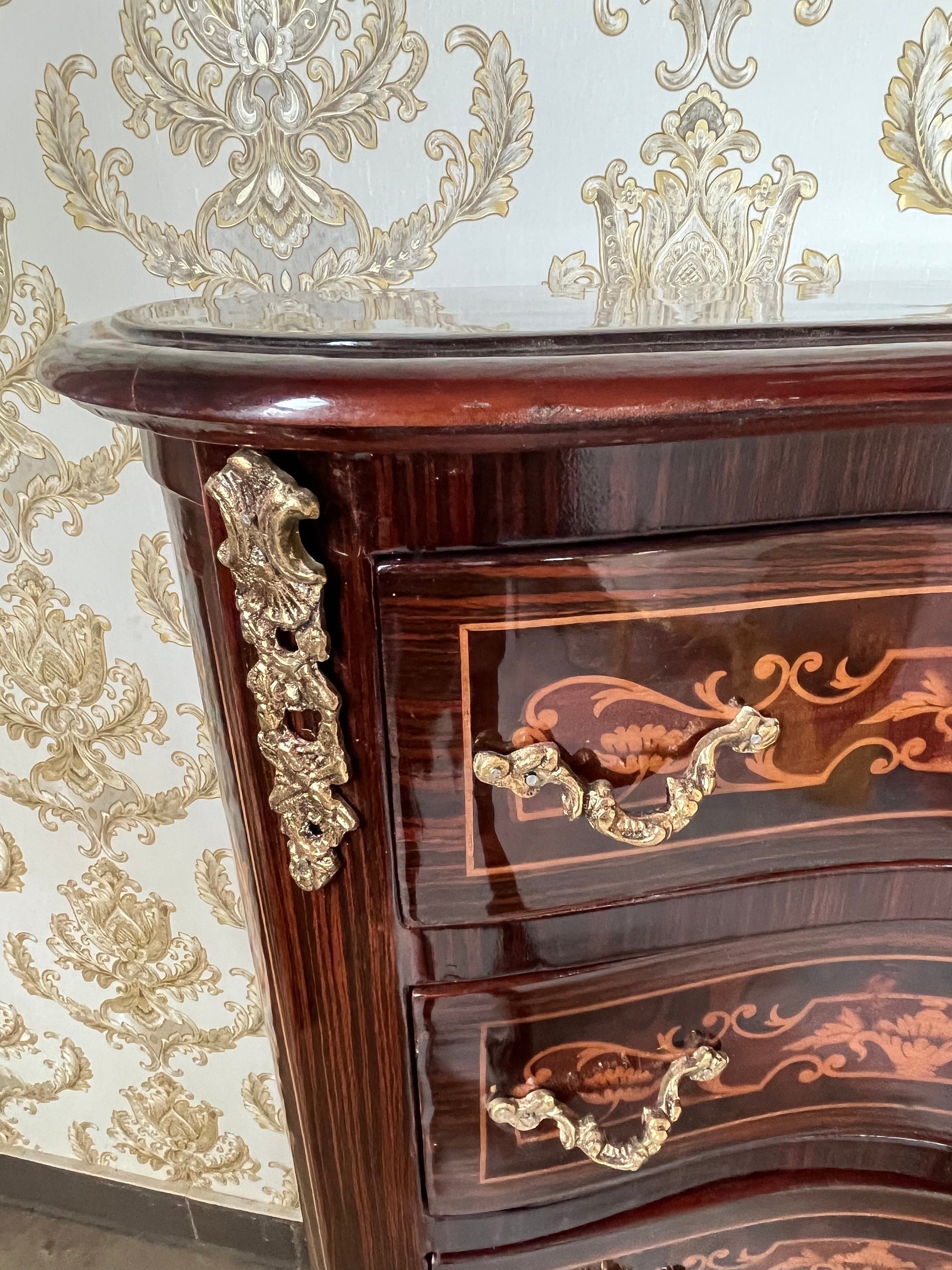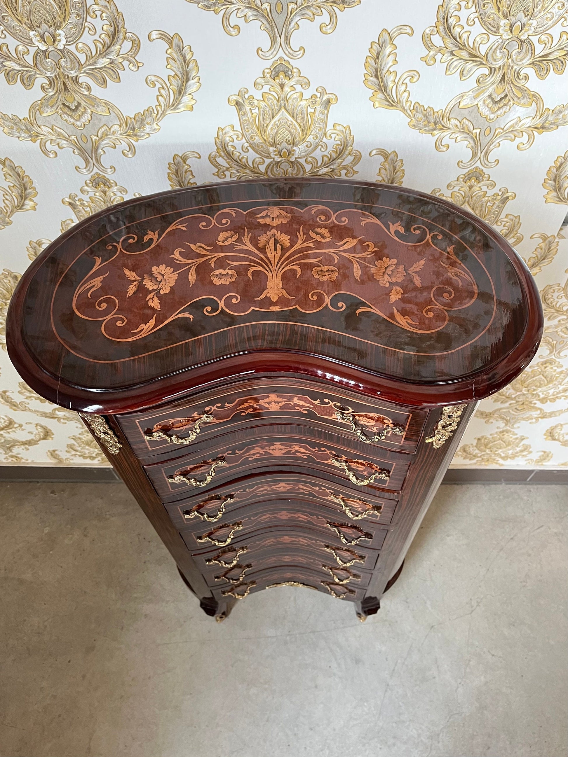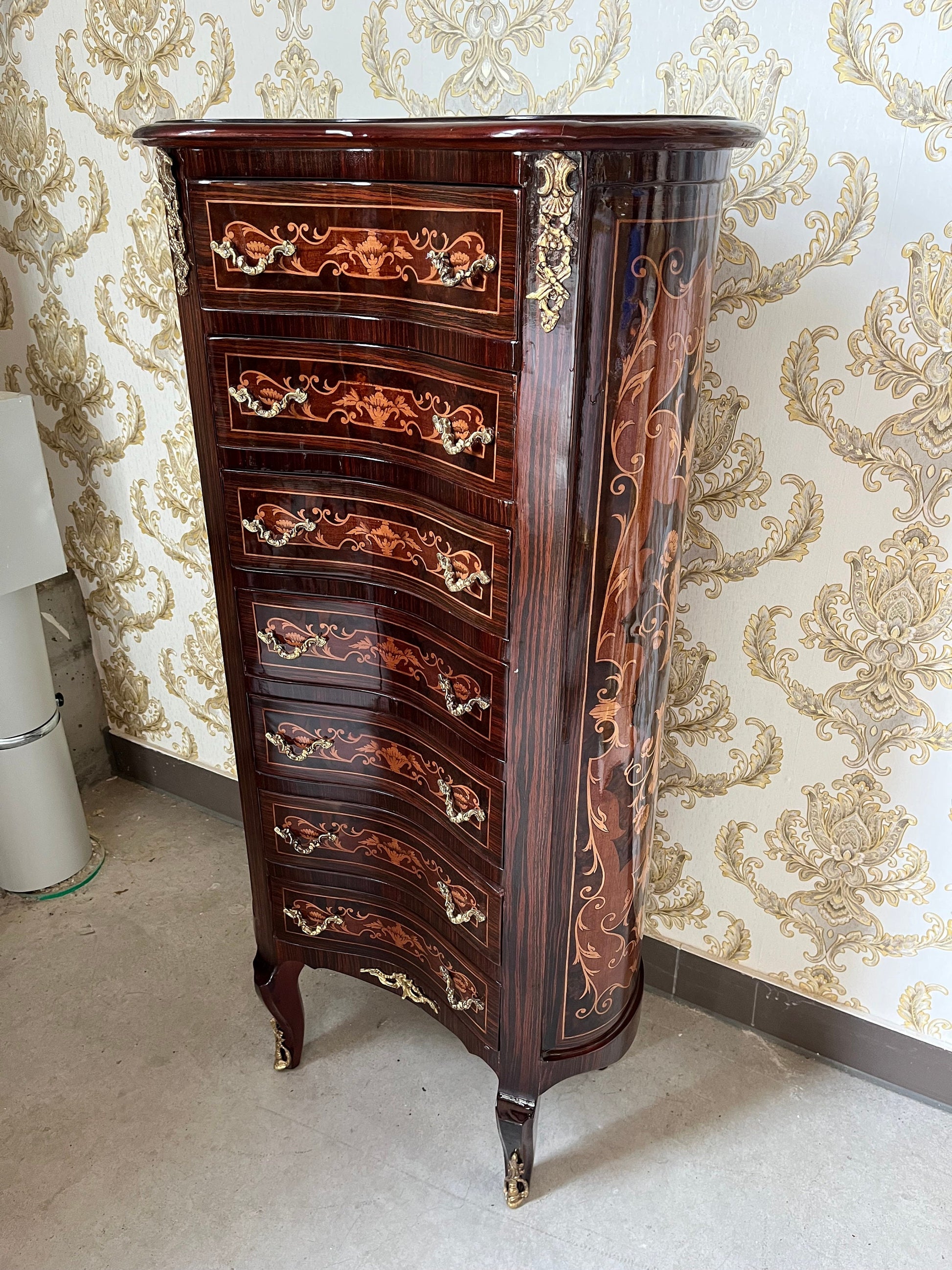 Curved tall chest of drawer inlaid with 7 drawers. This beautiful style is from French Louis XVI in reproduction.