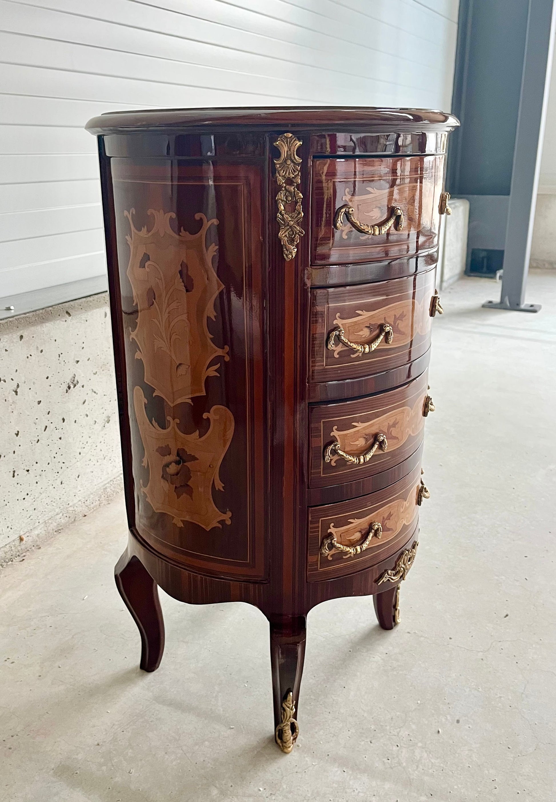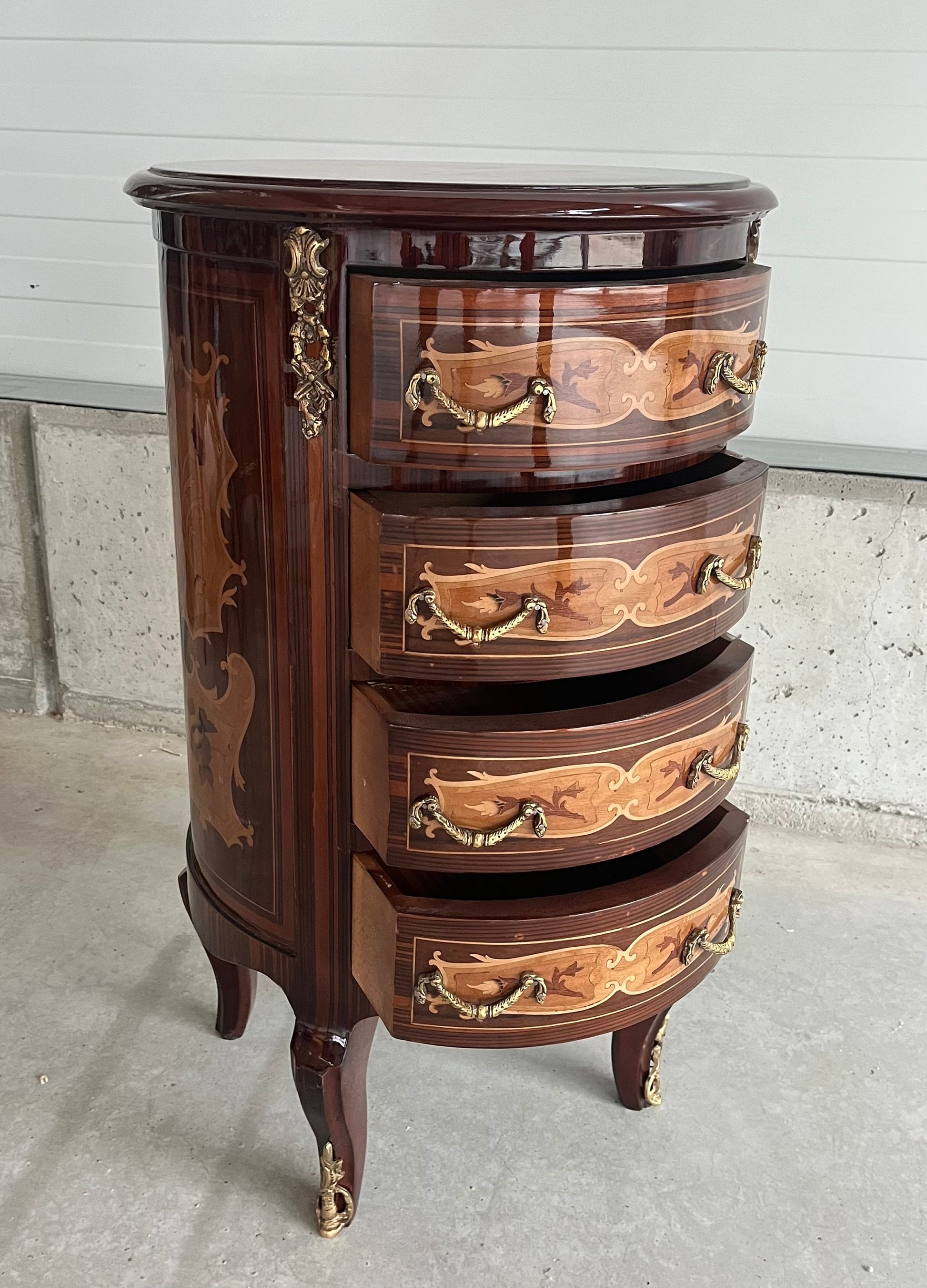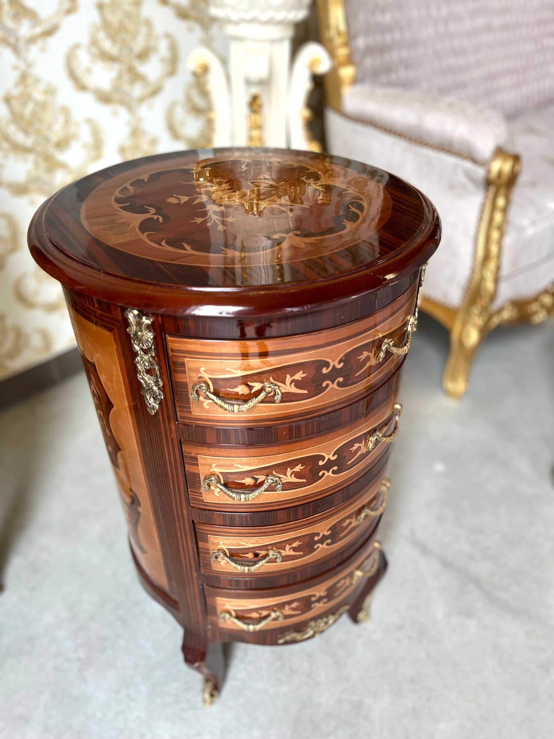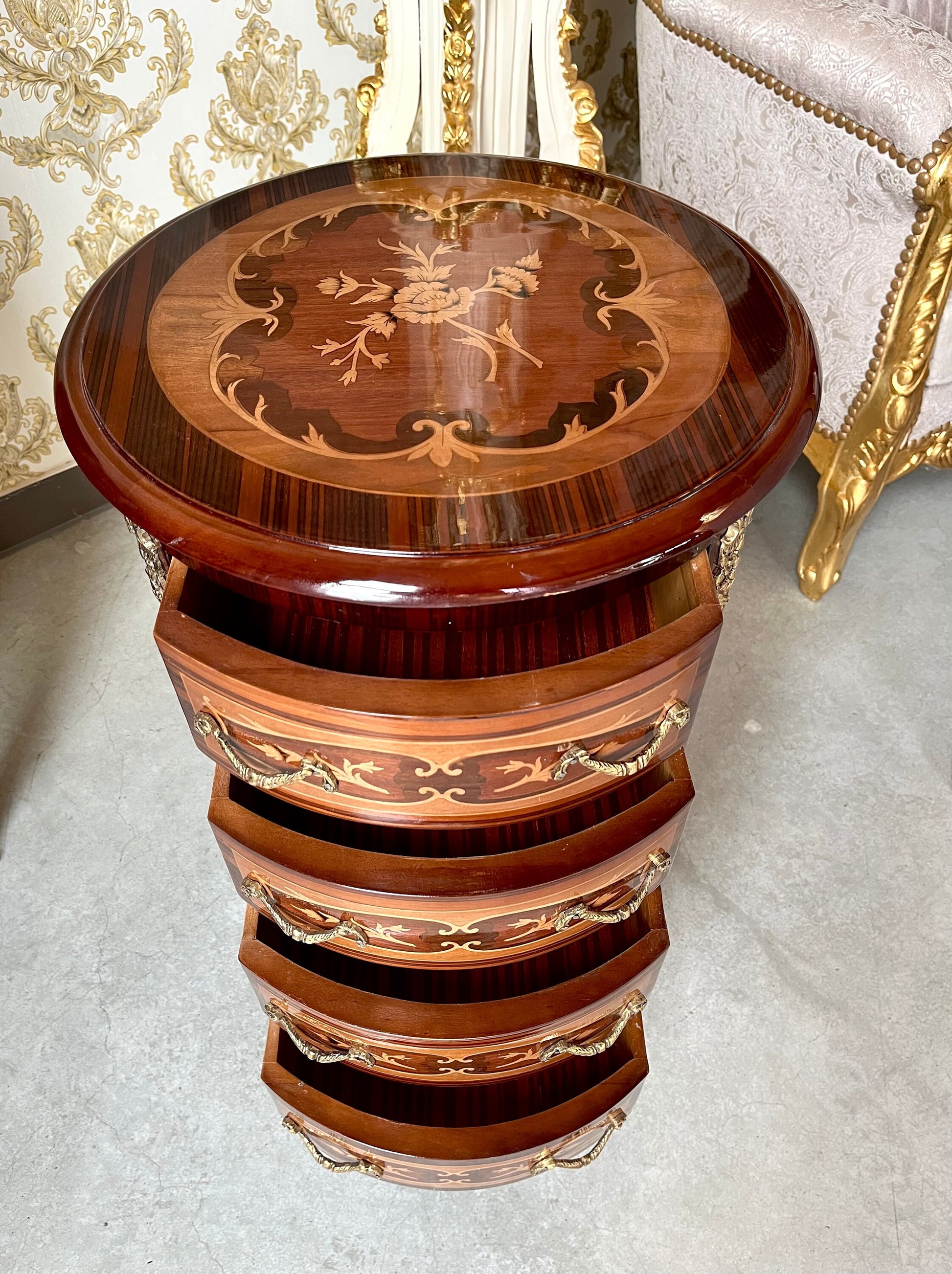 Louis XVI Antique style night stand reproduction in round shape inlaid 4 drawers.
