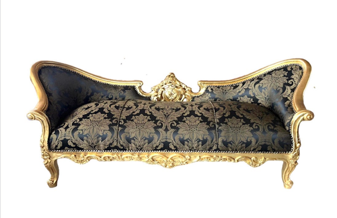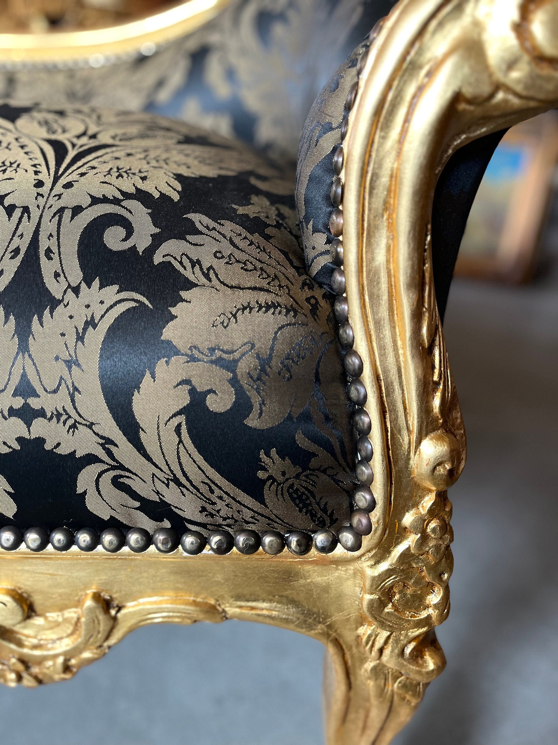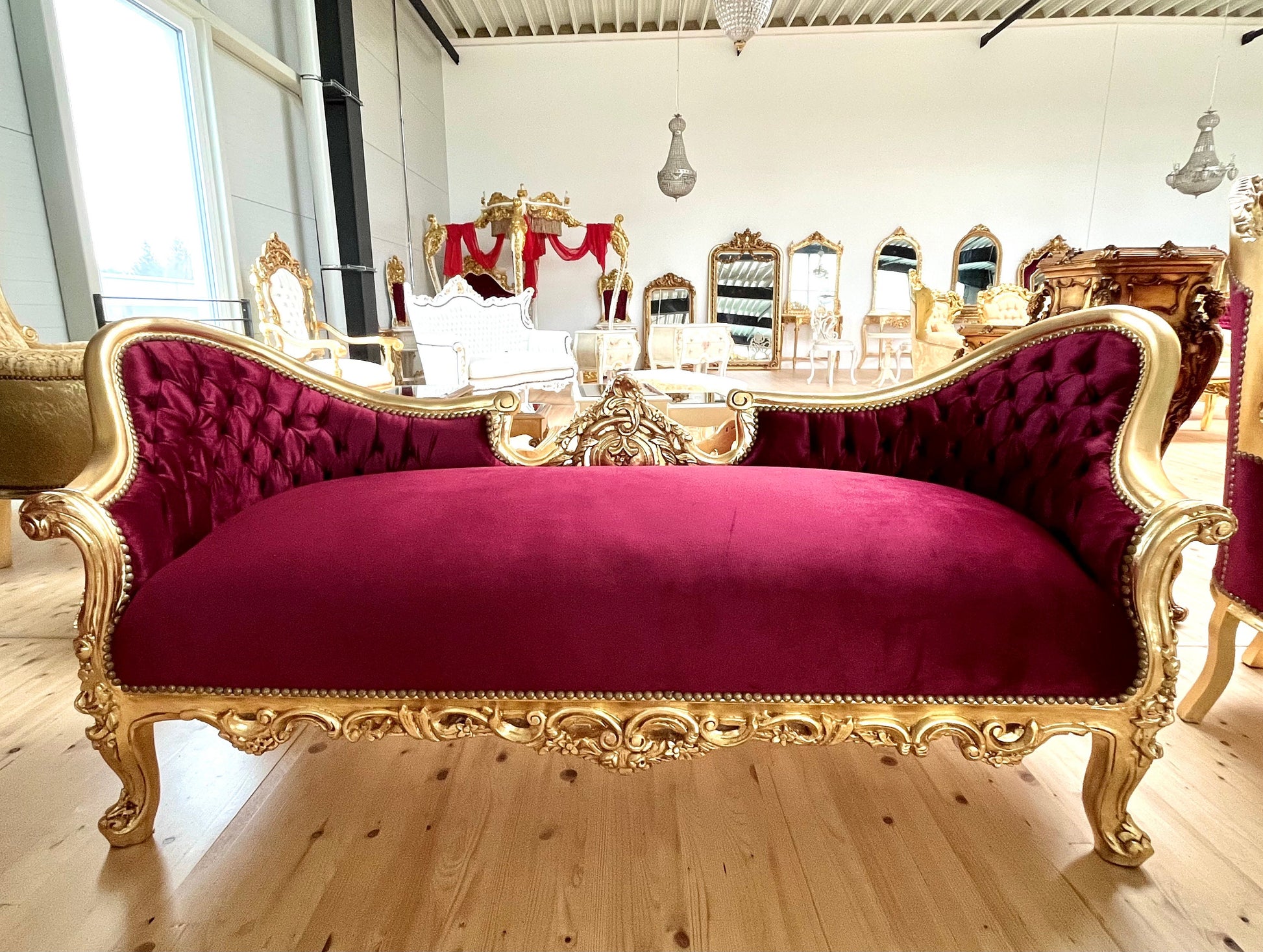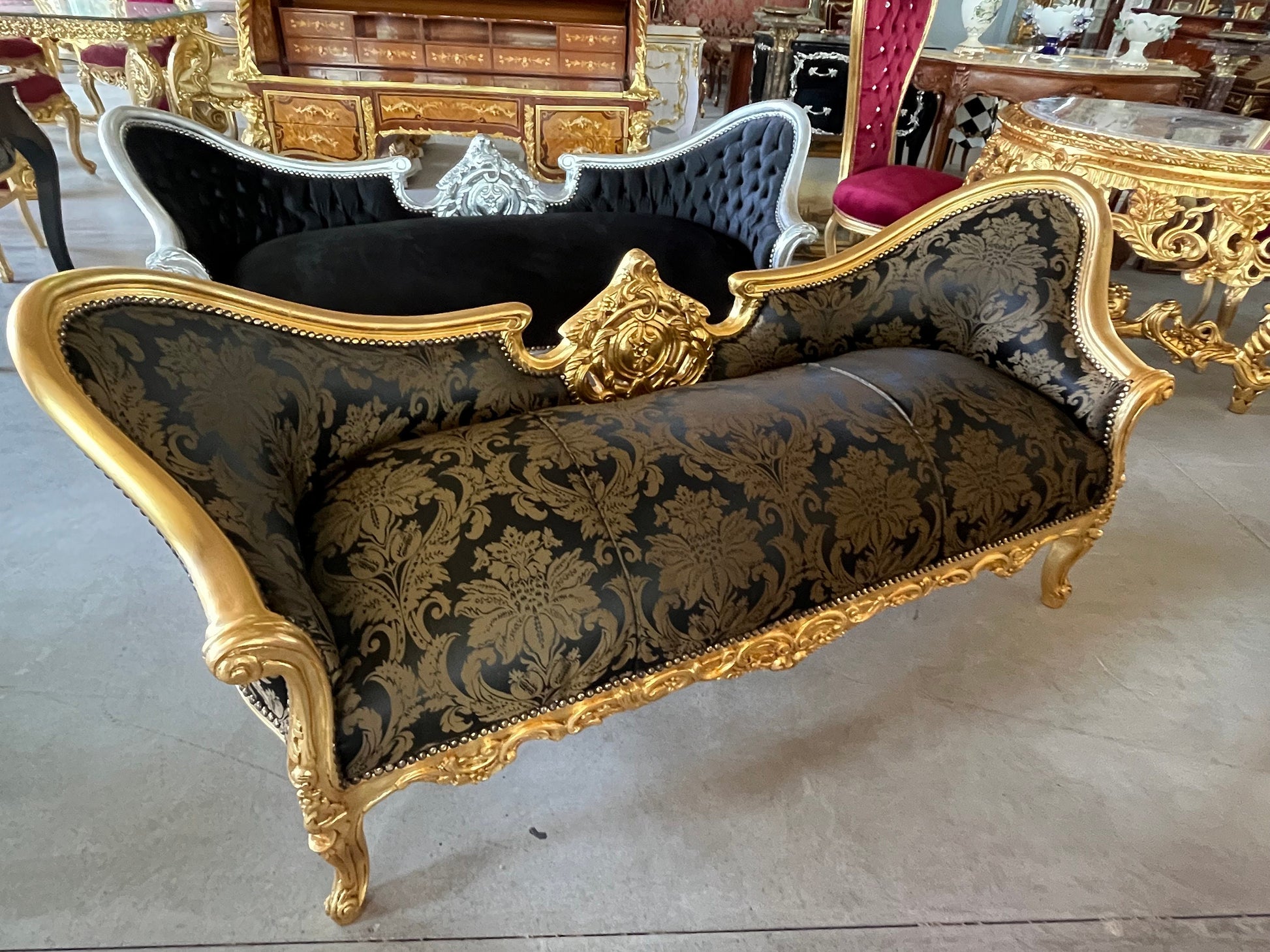The look is from antique baroque style reproduction. It is upholstered with velour fabric, handcrafted in solid beech wood and gilded with foil gold or silver leaf. It definitely sparks at a business occasion or commercial environment.