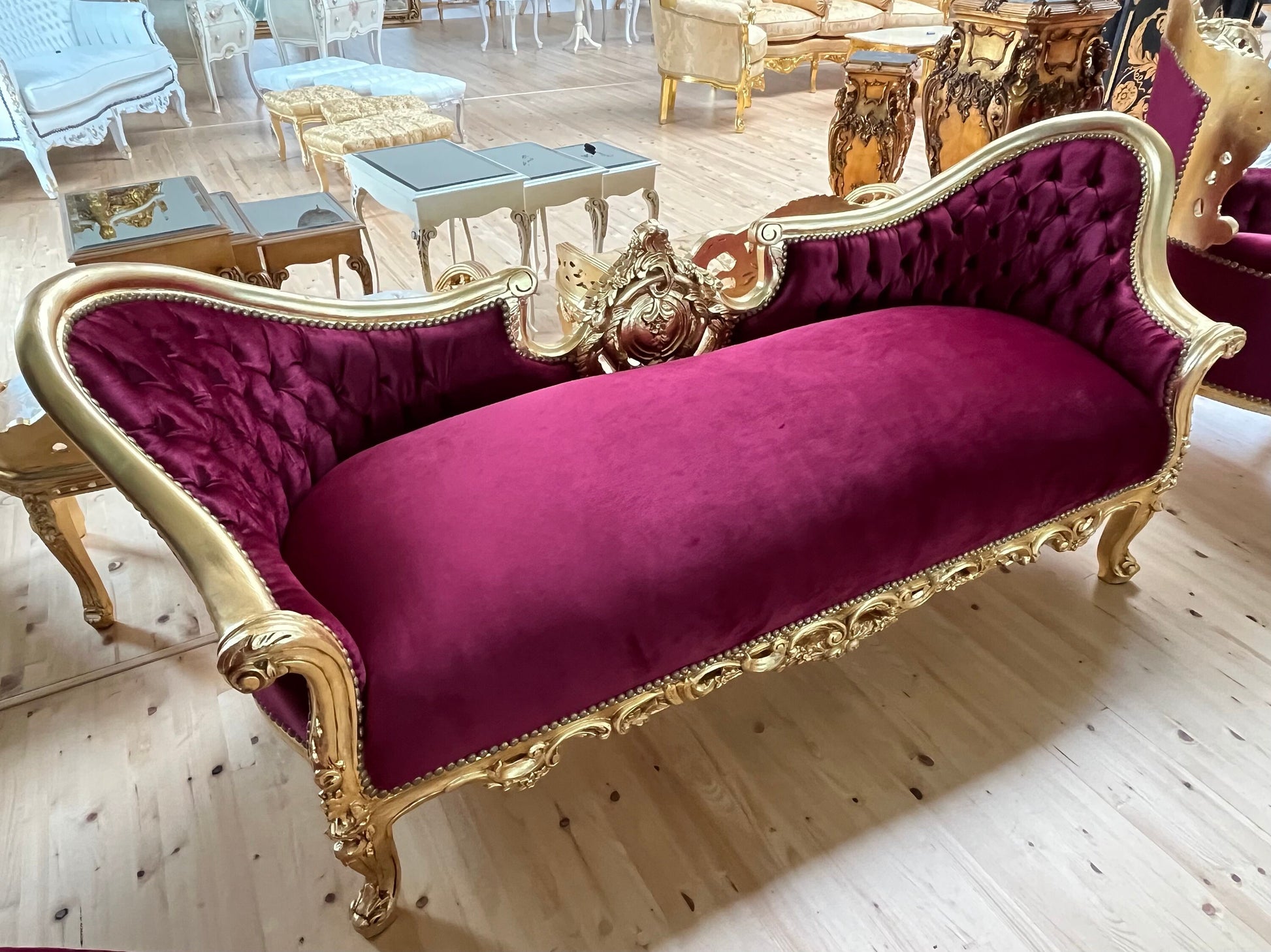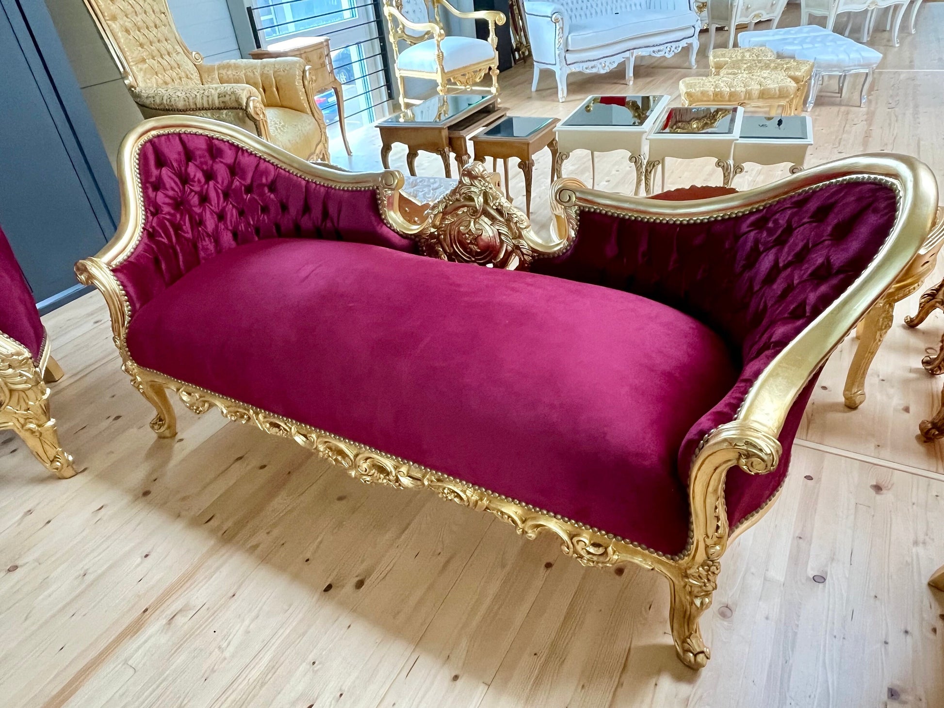 The look is from antique baroque style reproduction. It is upholstered with velour fabric, handcrafted in solid beech wood and gilded with foil gold or silver leaf. It definitely sparks at a business occasion or commercial environment.