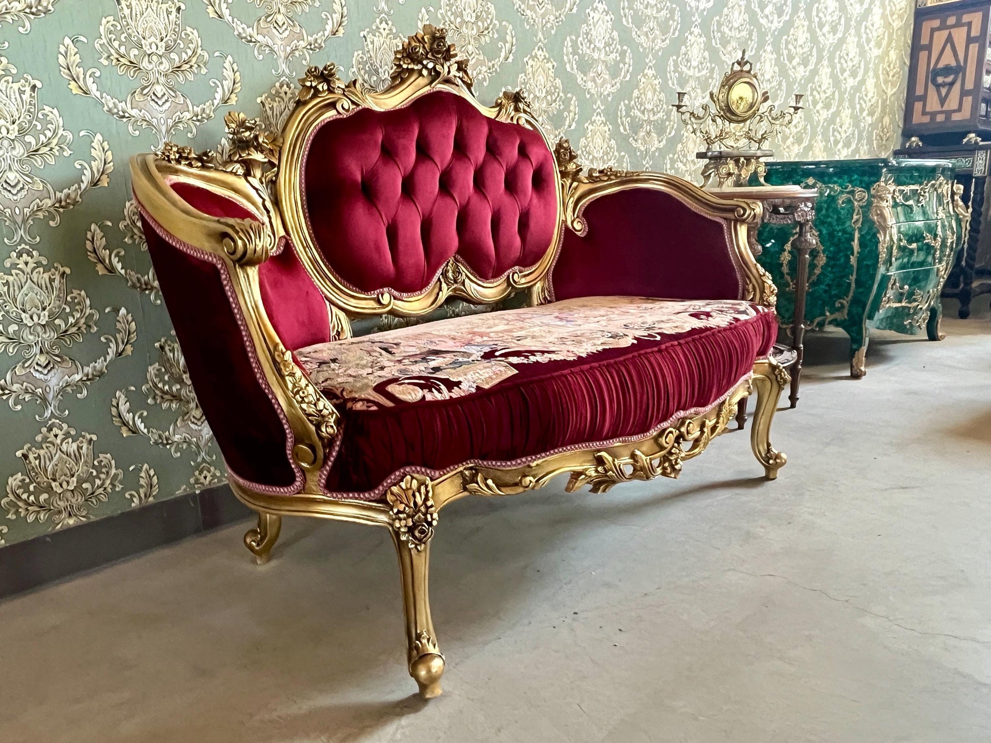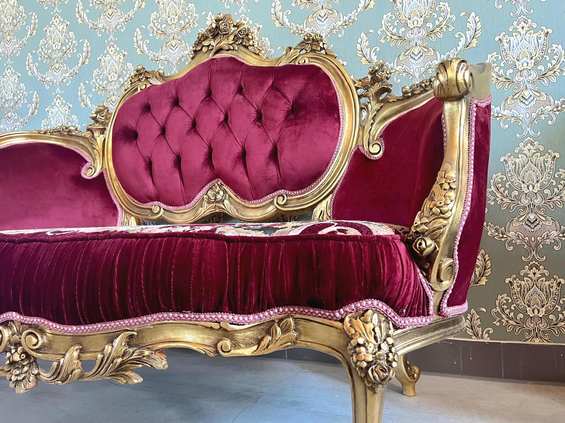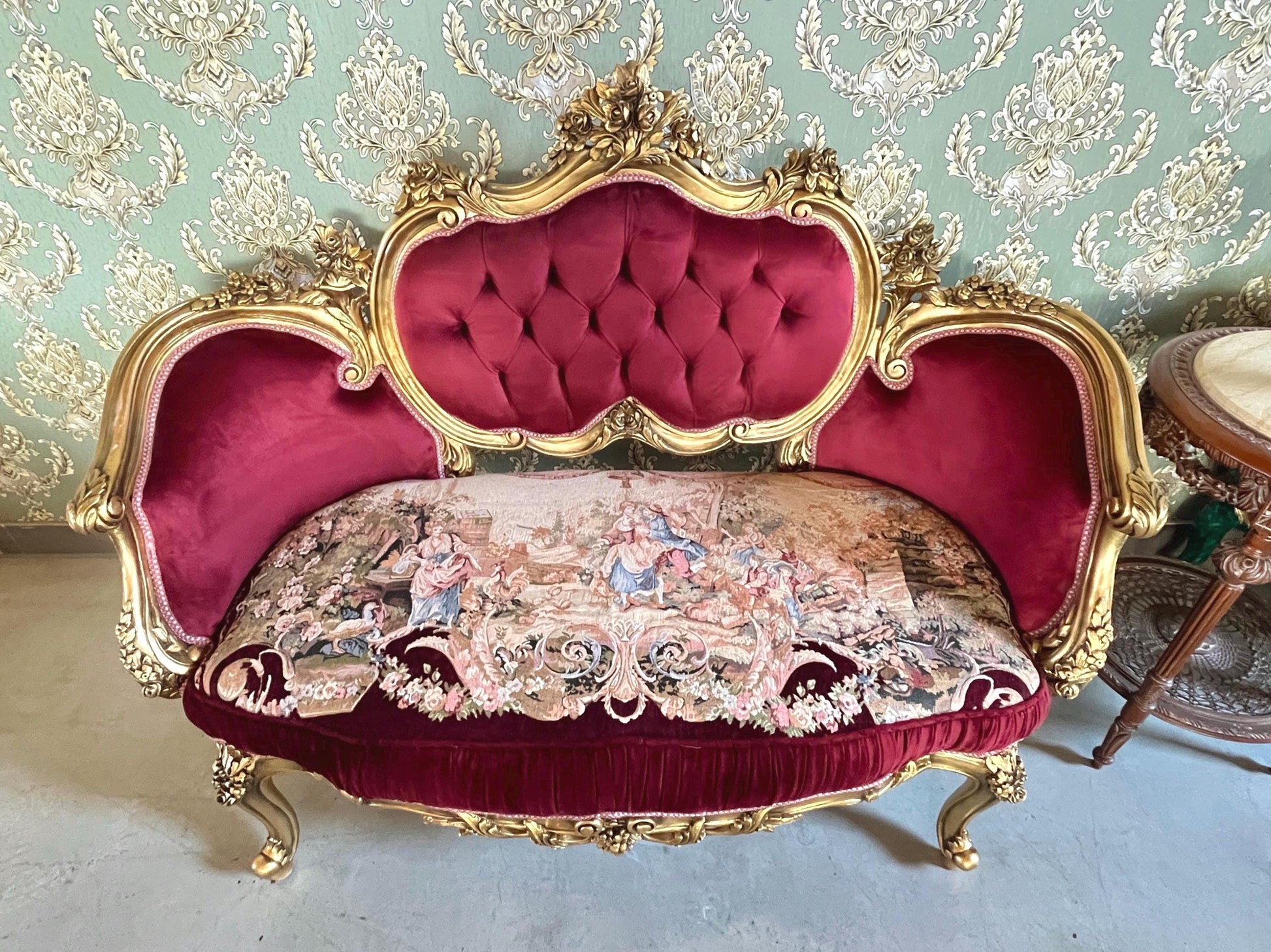 Love Seat French Royal Style Couch Bordeaux Red Velvet Sofa Nostalgic Antique Style Settee, Red Velvet Sofa Antique Baroque Style Home Decor