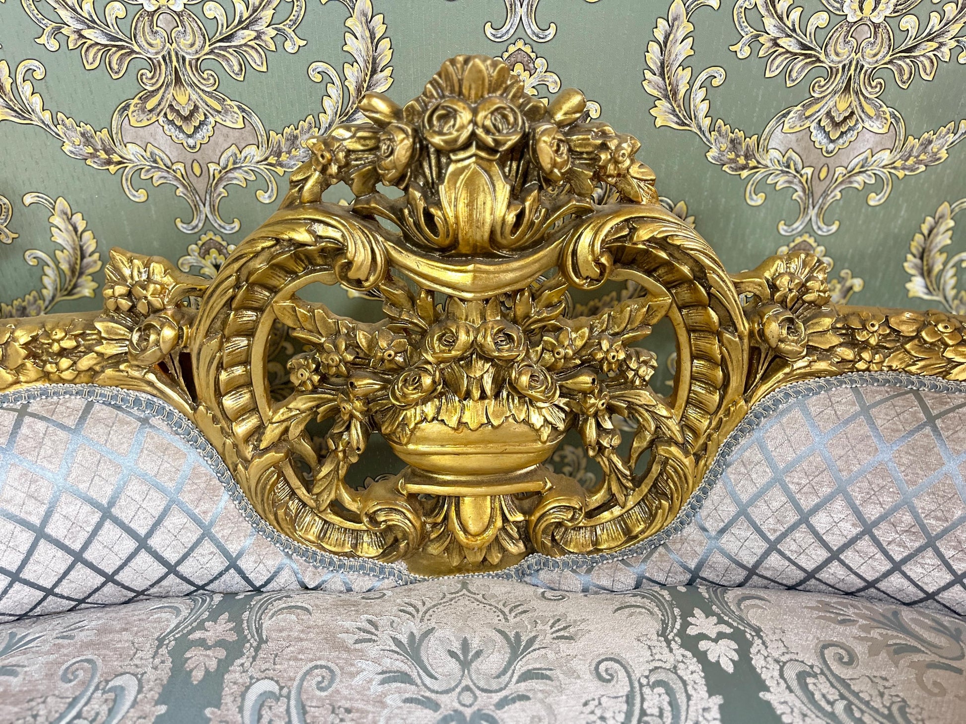 Love Seat Royal Baroque Style Bench Sky Blue Damask Flower Pattern Antique Style Couch in Gold Finish for Housewarming Party Xmas Home Gift
