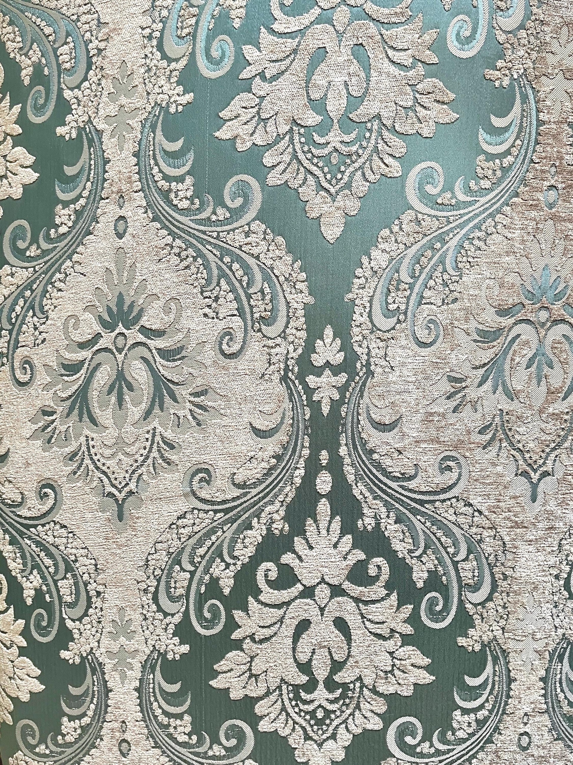 Handcrafted in solid wood, upholstered in sky blue velvet flower pattern damask and frame in antique gold finish. It’s glamorous, comfortable and stable.