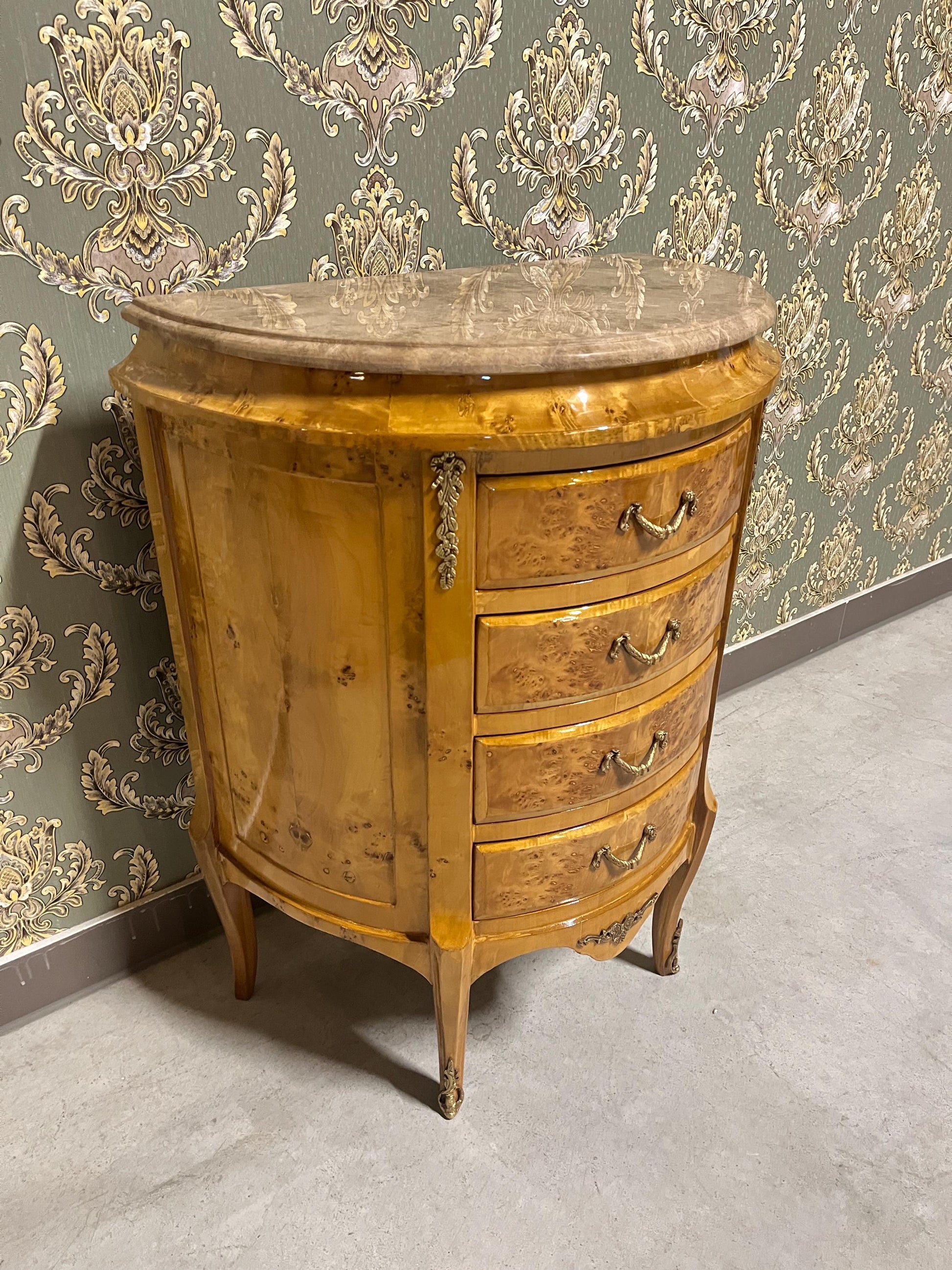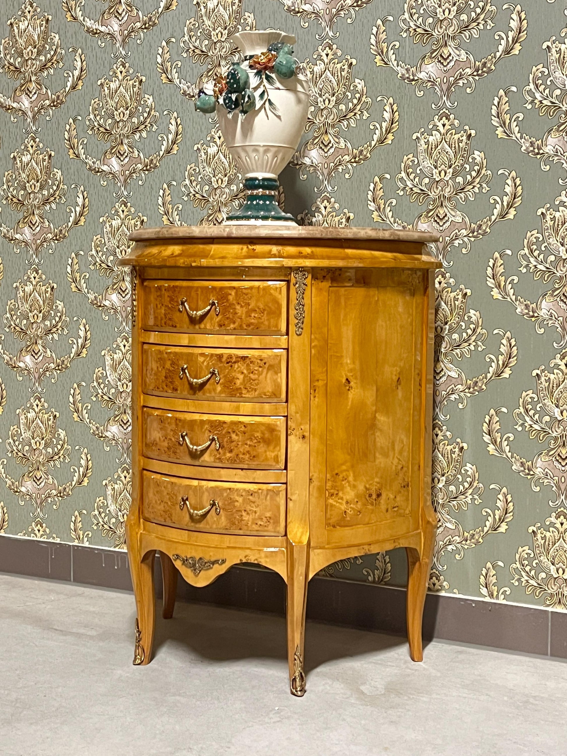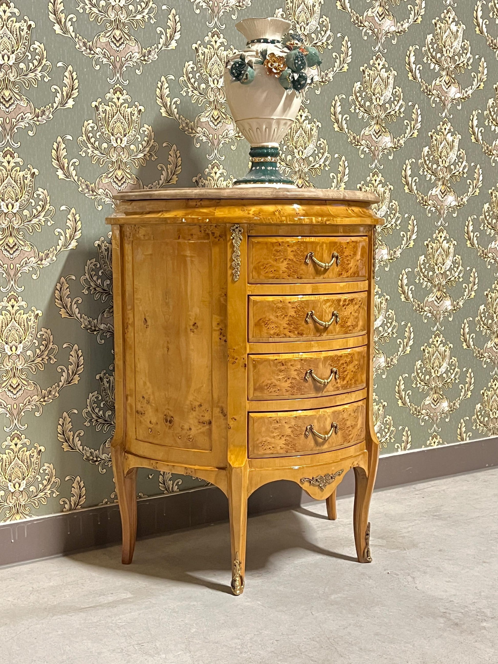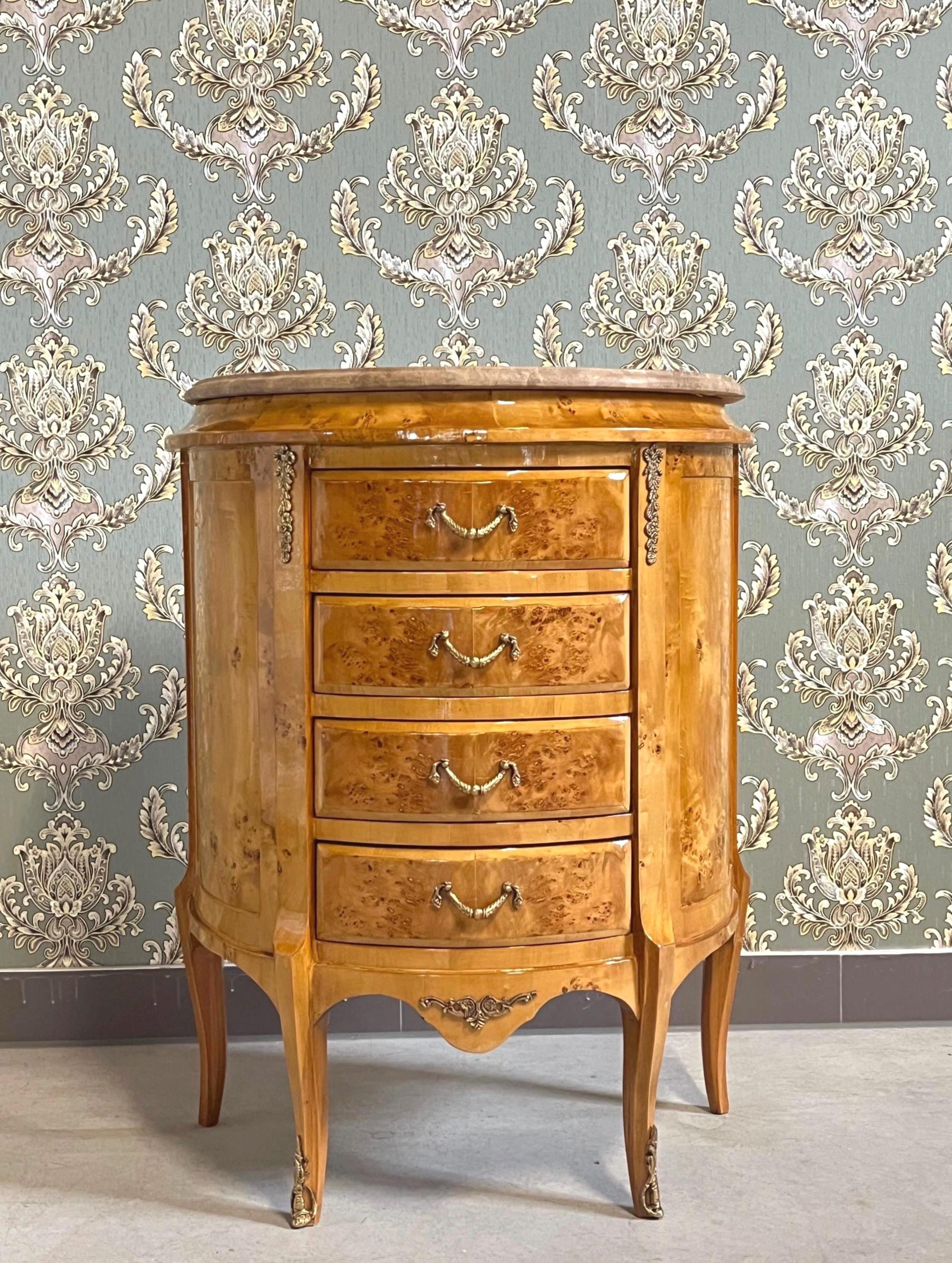 French Antique style night stand reproduction in oval shape inlaid 4 drawers.