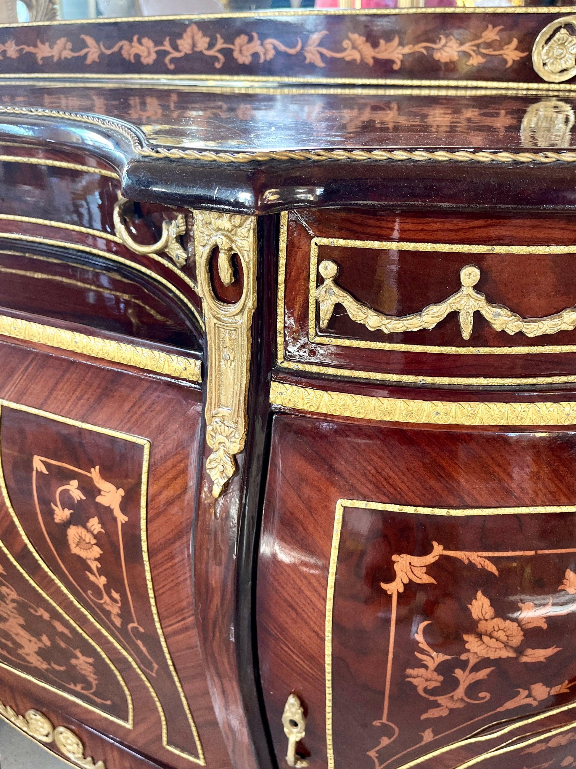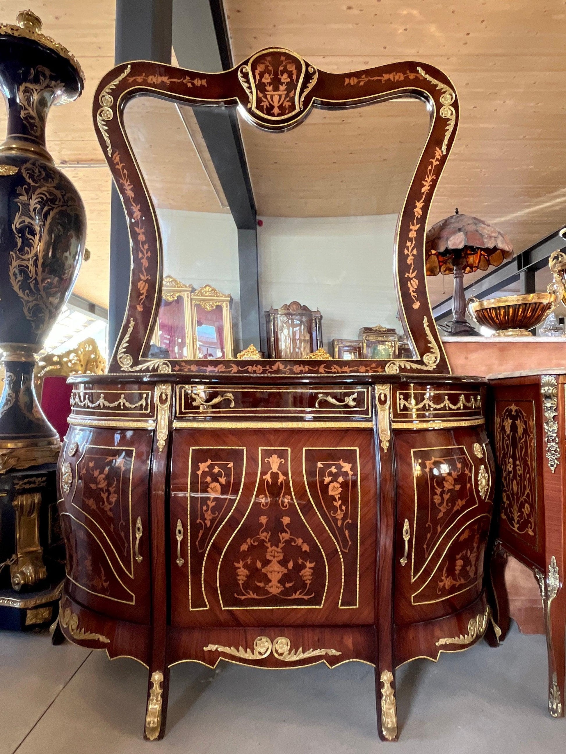 A wooden mirror cabinet console in retro baroque antique style reproduction. It’s suitable in a bedroom or in a commercial environment.
